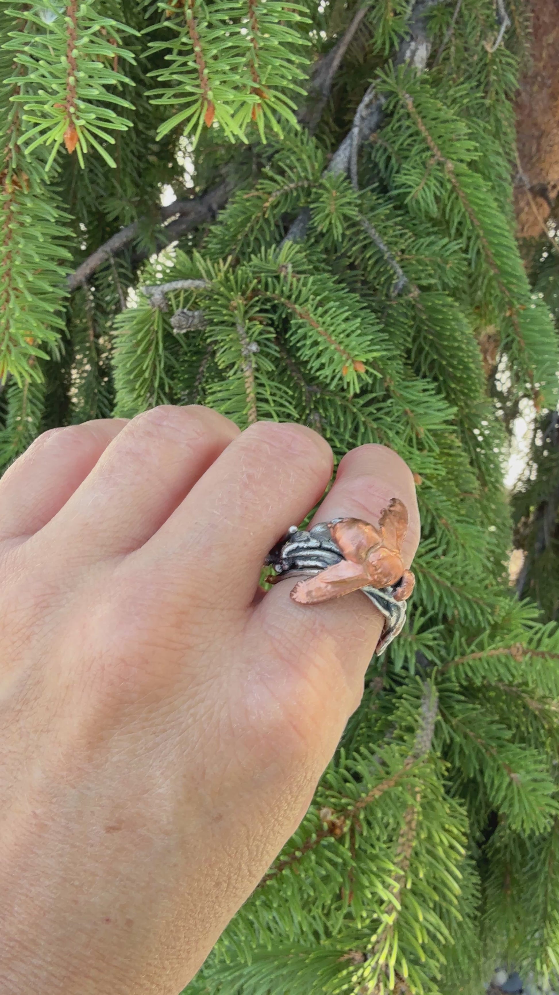Turn heads with the Adjustable Bee Ring in Silver & Copper. Crafted from a real bee preserved in warm copper, every detail captures nature’s wild beauty. The organic textures and mixed metals create a statement piece that’s equal parts fierce and refined. Adjustable to fit sizes 7–9, it’s a wearable work of art for those who dare to be unforgettable.