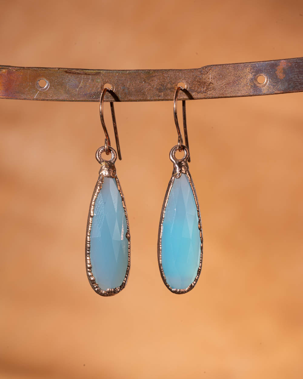 These lovely aqua chalcedony earrings are the perfect pop of color. The color of the stones contrasts so nicely with the pure copper setting. Set in pure copper which is hypoallergenic. These are just under 2 inches long and are extremely lightweight and easy to wear. Weighing just 4 grams each, a US quarter weighs 6 grams.