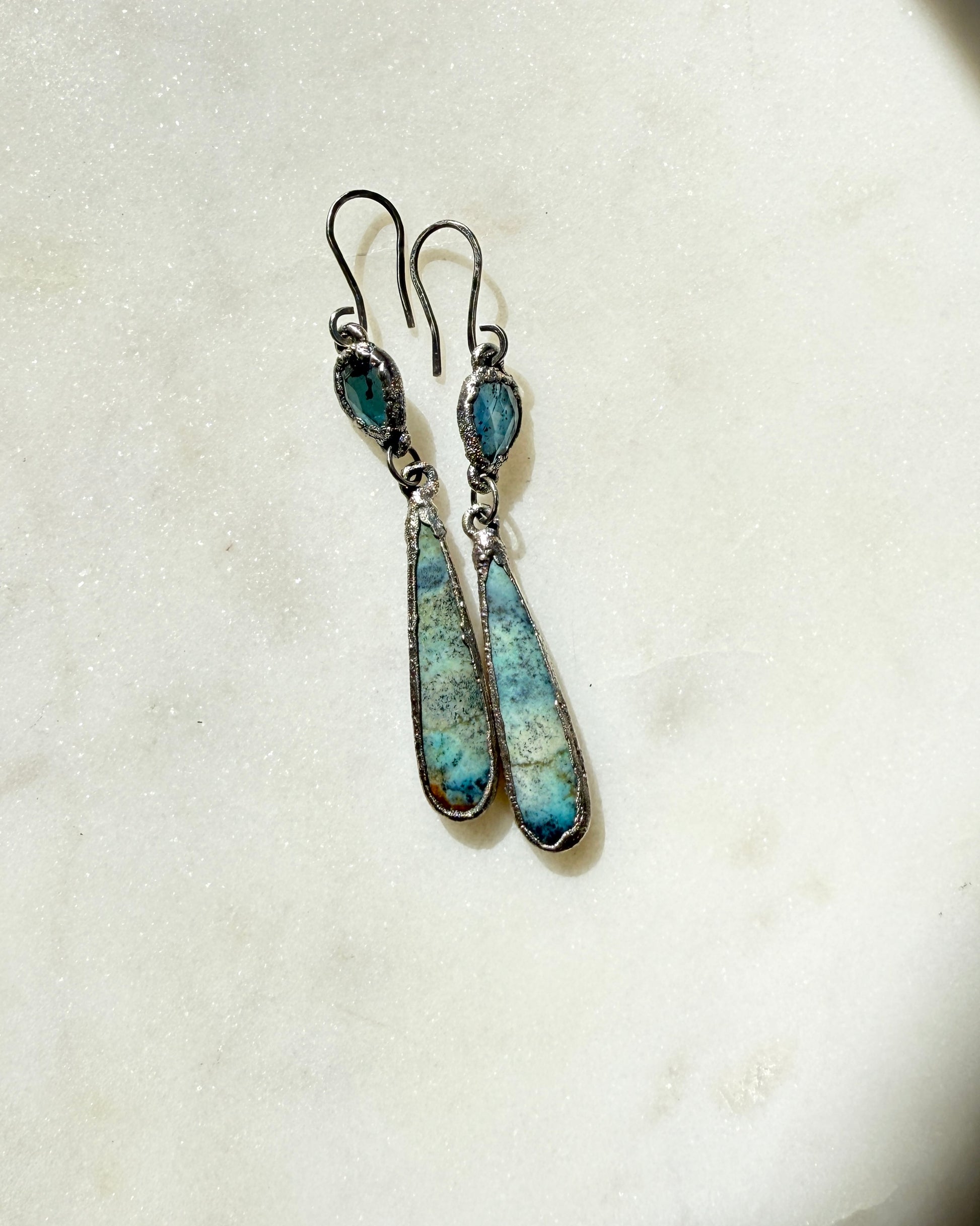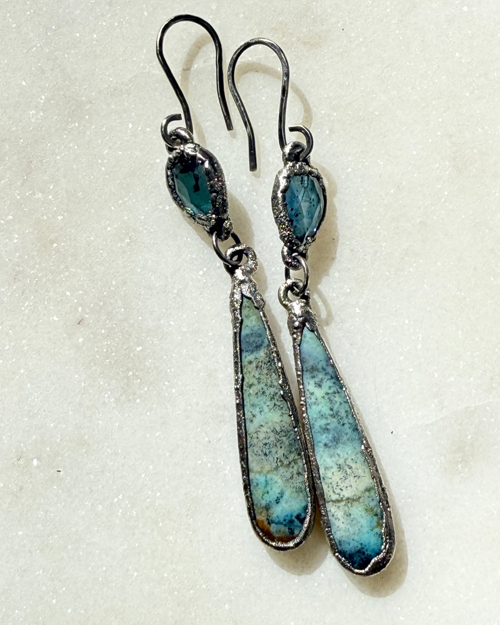 Graceful and striking, these lightweight earrings feature opalized wood and shimmering kyanite stones, electroformed in textured silver. The natural blues and sparkly facets blend effortlessly with the organic silver setting, creating a dangle that moves with light and life. Perfect for adding a touch of refined, earthy elegance to any look.