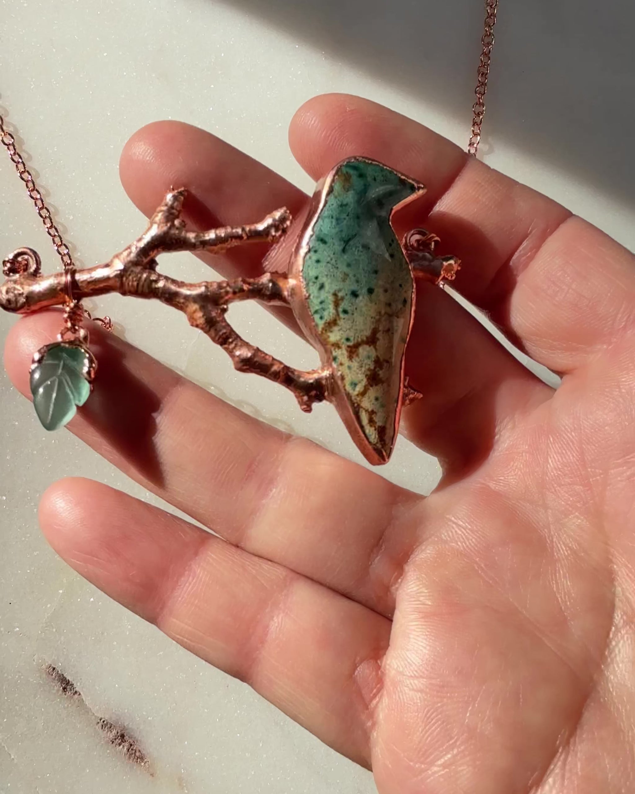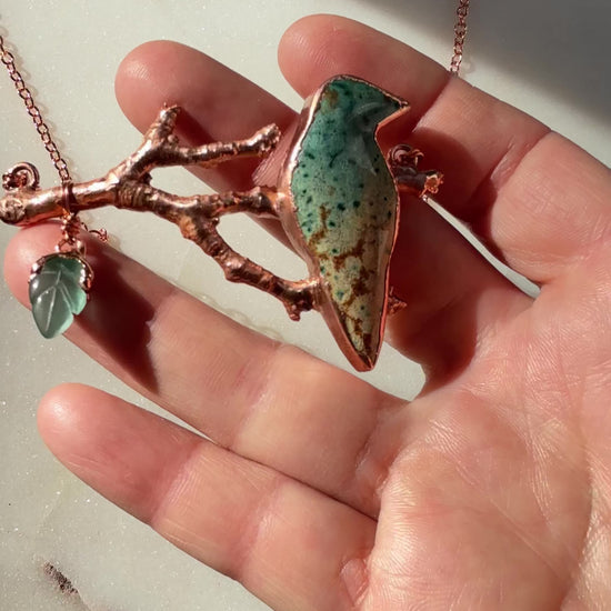 A striking fusion of nature’s artistry, this necklace features a bird-shaped hand-cut Morning Dew Jasper stone perched on a genuine branch, electroformed in warm copper. A delicate chalcedony leaf adds a whisper of softness and light. Suspended from a copper chain, this piece captures the wild spirit of the forest with raw elegance and timeless strength.