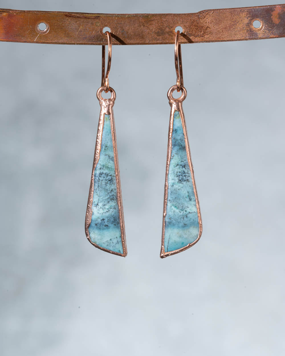 Add some natural and unique flair to your jewelry collection with our Blue Opal Wood Earrings. Crafted from opalized wood stones from Indonesia and set in copper, these earrings are sure to be eye-catching and one-of-a-kind. Embrace your individuality with this playful and quirky addition to your wardrobe. About 2 inches long and weighing just 3 grams each. (A US quarter is 6 grams.)
