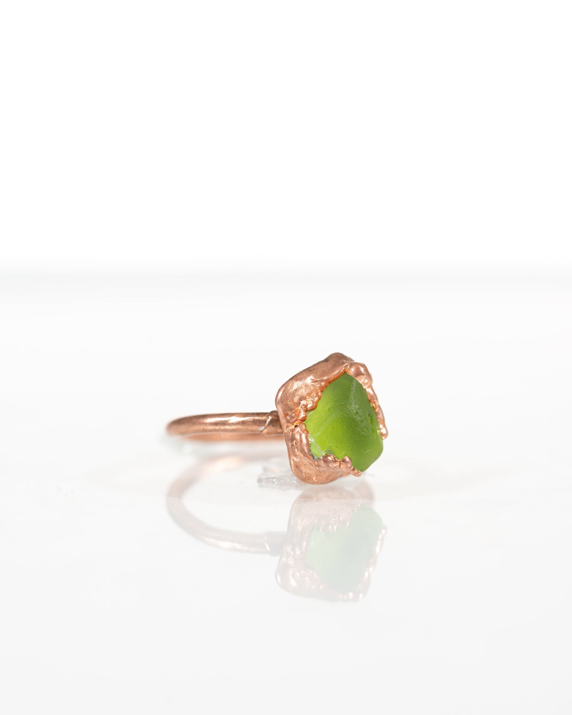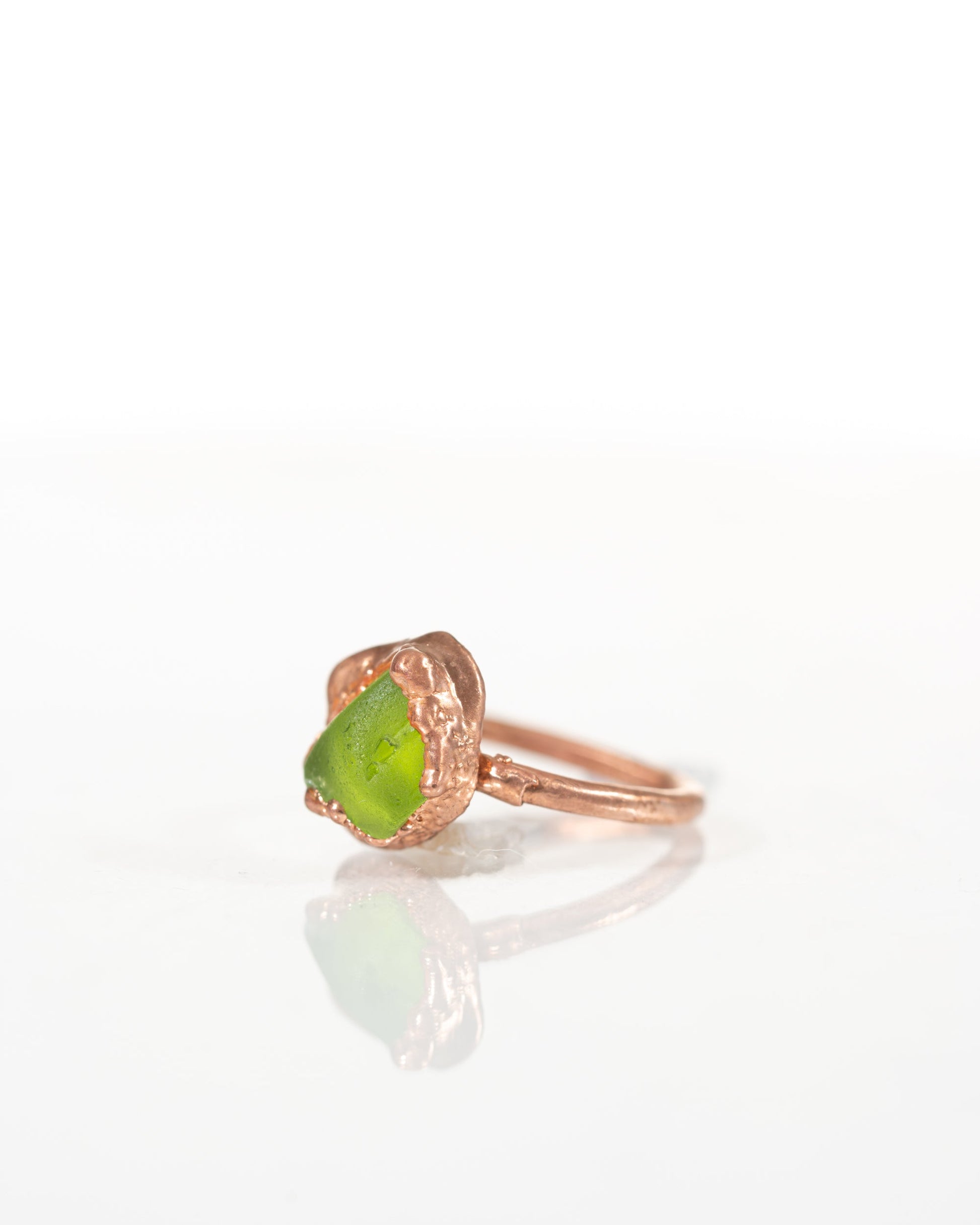 Make a splash with this electrifying Chartreuse Green Sea Glass Ring. Each unique piece of sea glass is set in copper, creating a one-of-a-kind accessory that is sure to turn heads. Available in size 7.5, this ring is perfect for adding a pop of color to any outfit.