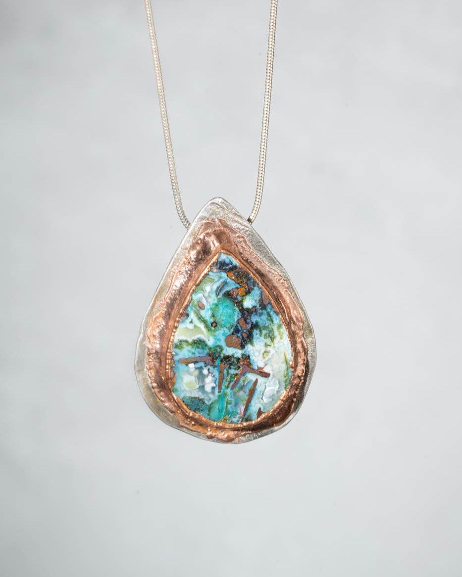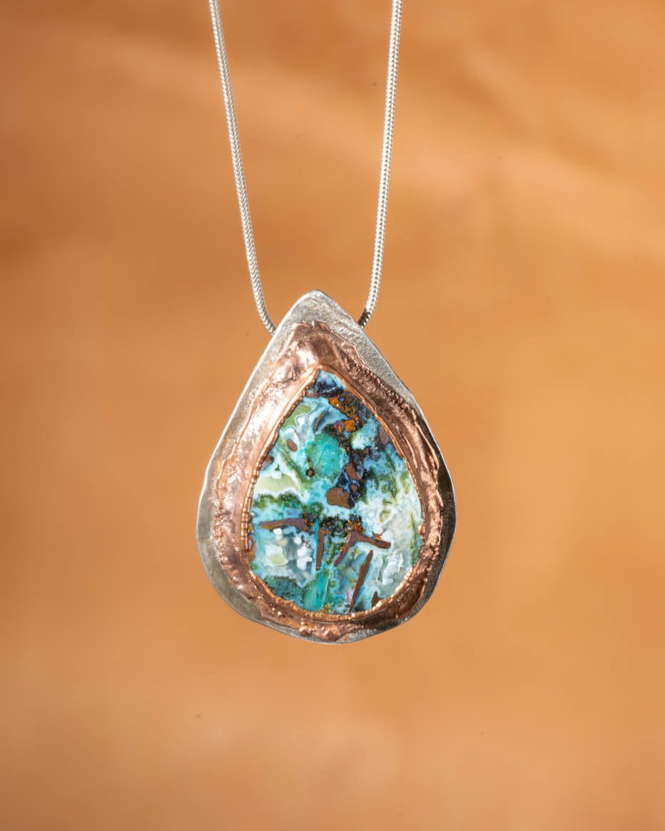 Add a touch of color and a dash of fun to your wardrobe with this Chrysocolla with Copper Necklace. Featuring a stunning Chrysocolla stone with native copper in the stone, set in copper on a silver backplate, this necklace comes with a 20 inch sterling silver snake chain.