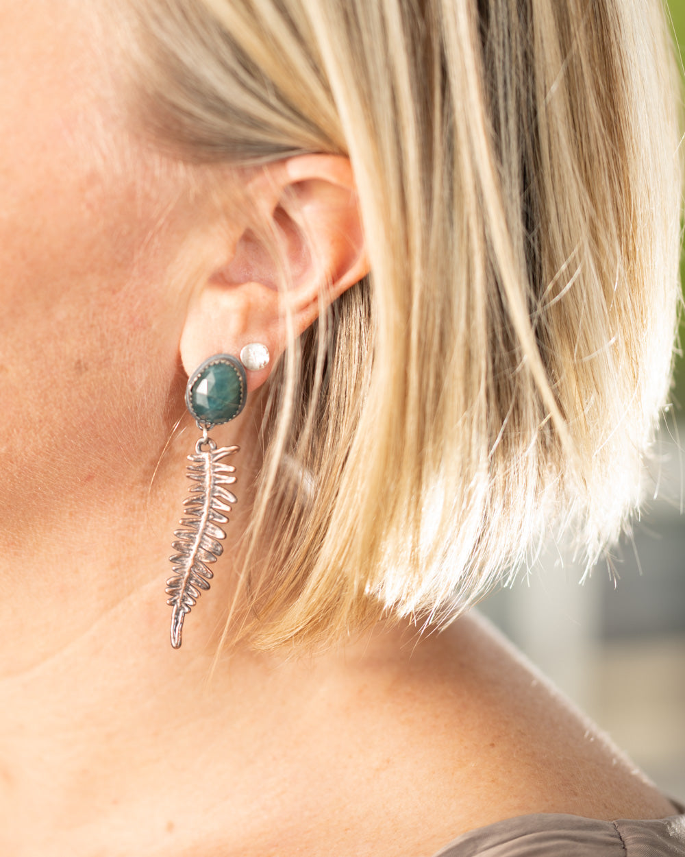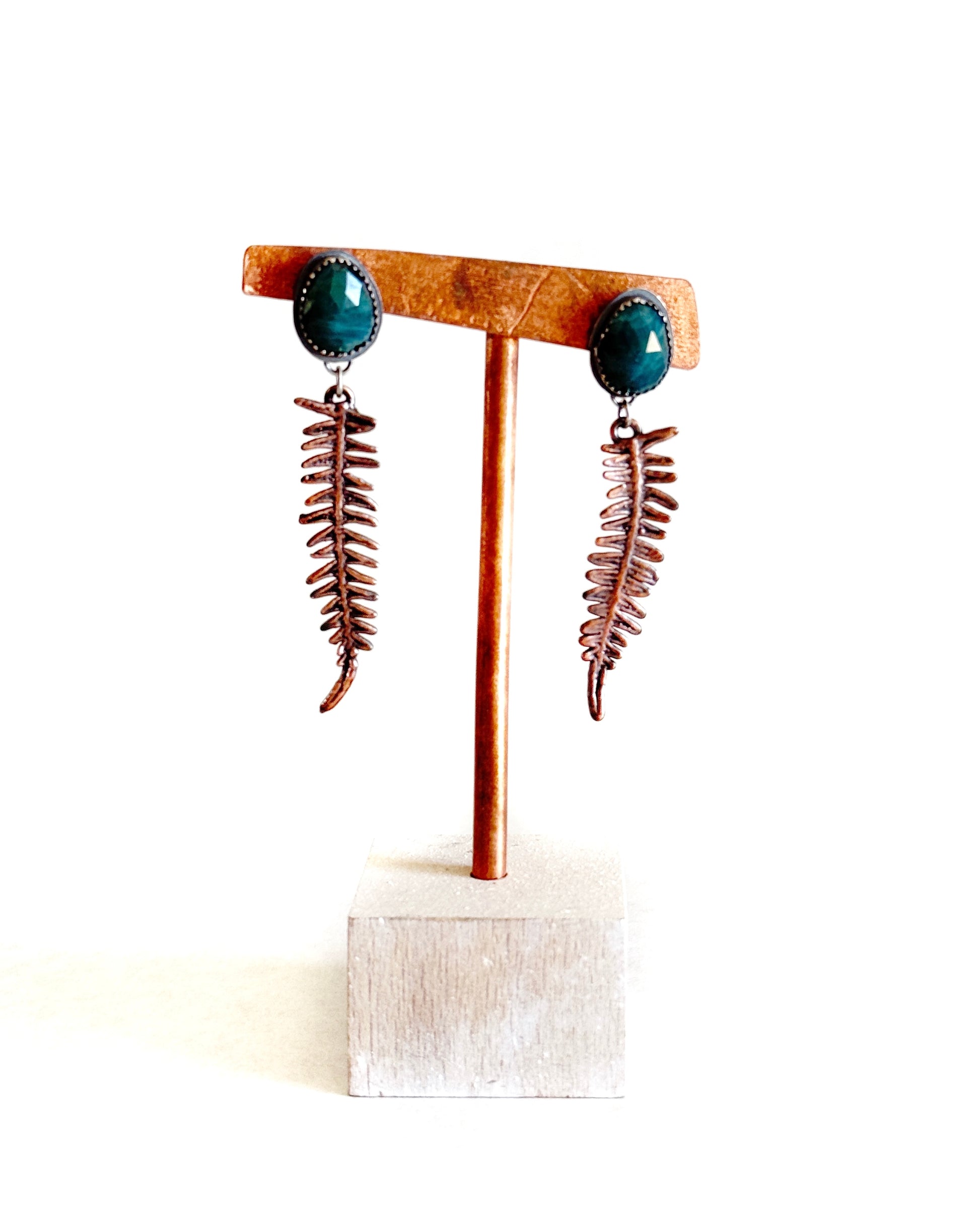 Add a touch of nature to your look with our Fancy Fern Earrings. Crafted with real ferns coated in luxurious copper, these earrings feature stunning blue green gemstones that will add a pop of color to any outfit. Elevate your style with these unique and beautiful earrings today! Sterling silver posts and backs. Lightweight at just 4 grams!