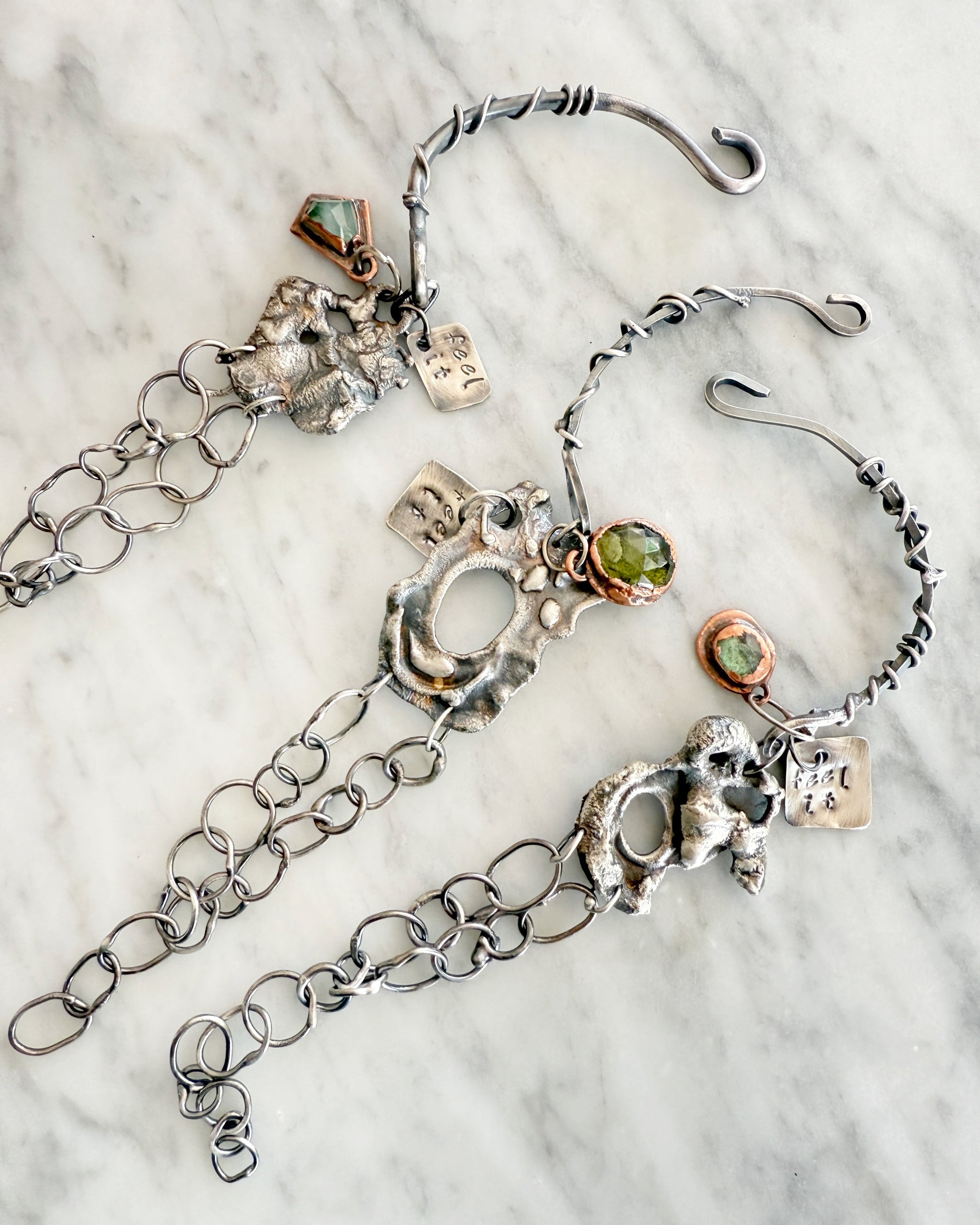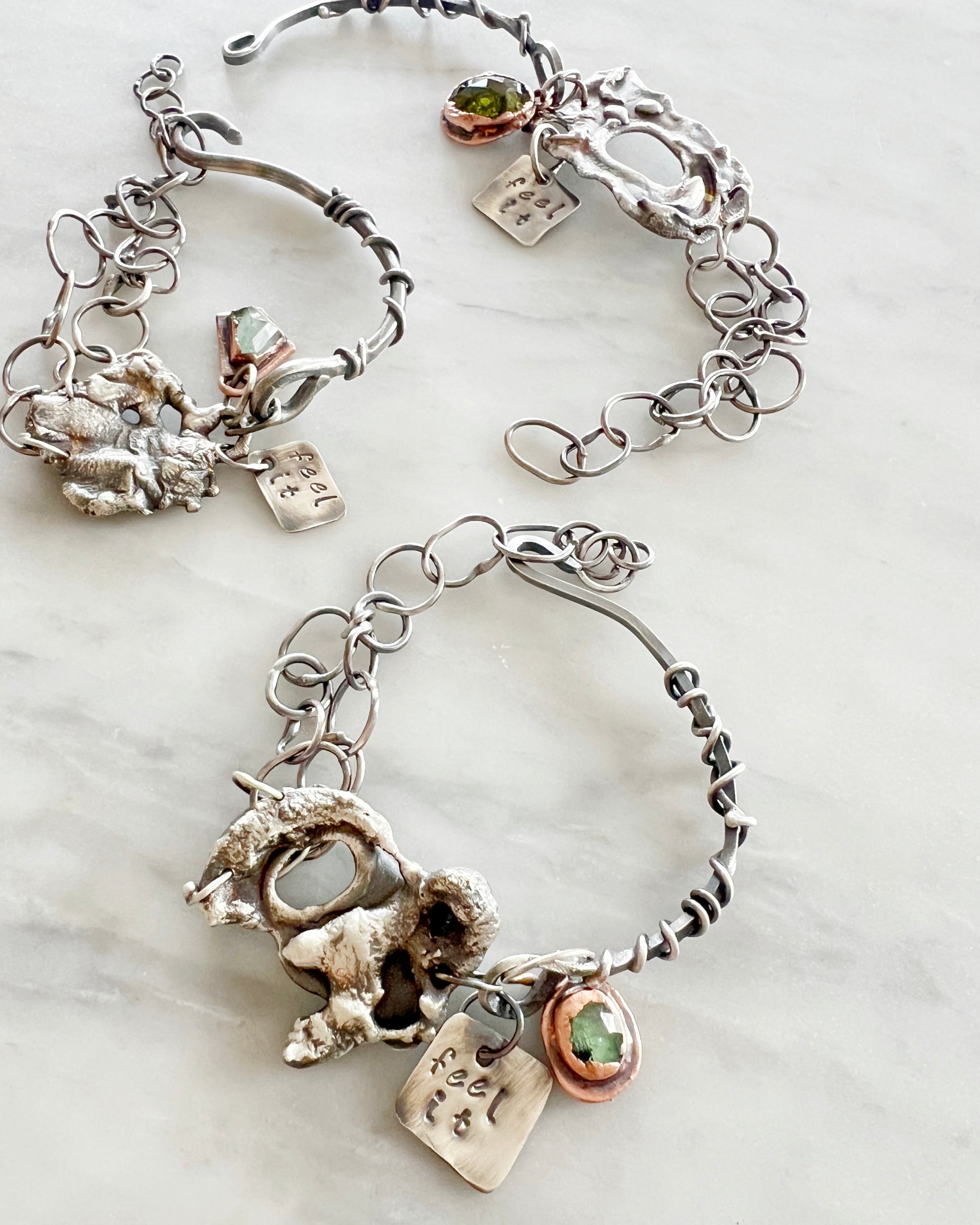 The "Feel It" Bracelet is a beautiful and tactile reminder to embrace and acknowledge your feelings. Made with expertly crafted flame sculpted sterling silver and accent gemstones, this bracelet serves as a supportive companion in your journey towards emotional well-being. Choose from tourmaline, kyanite or moldovite stone. Will fit up to a 7 inch wrist, but can be made longer, simply include a note with your order.
