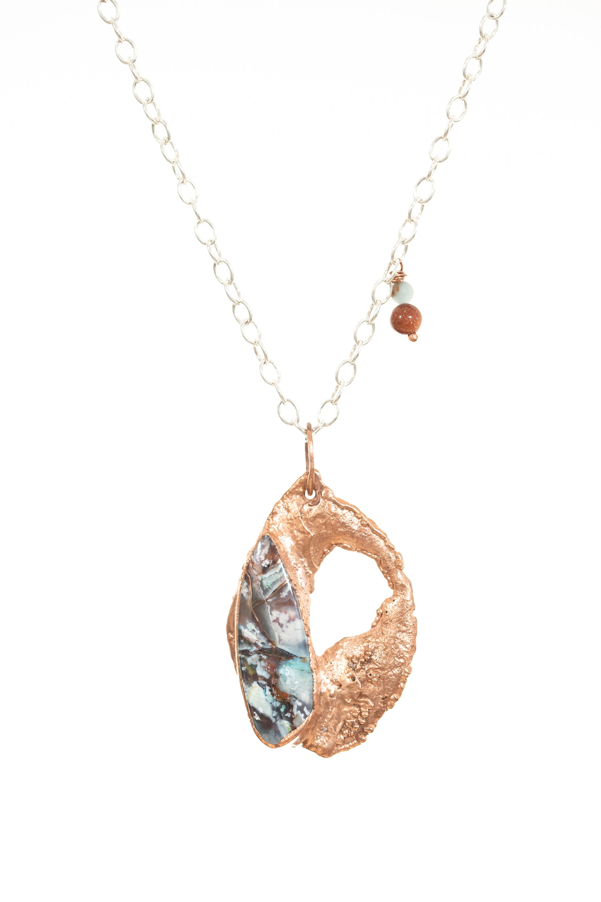 Unleash your inner creativity with our Funky Chrysocolla Necklace! Crafted with a torch-sculpted copper pendant and a stunning chrysocolla stone, this necklace will add a pop of color and unique flair to any outfit. The sterling silver chain with gemstone bead detail adds an extra touch of elegance. Get ready to stand out with this one-of-a-kind accessory! Chain is 20 inches long, pendant is 2 inches.