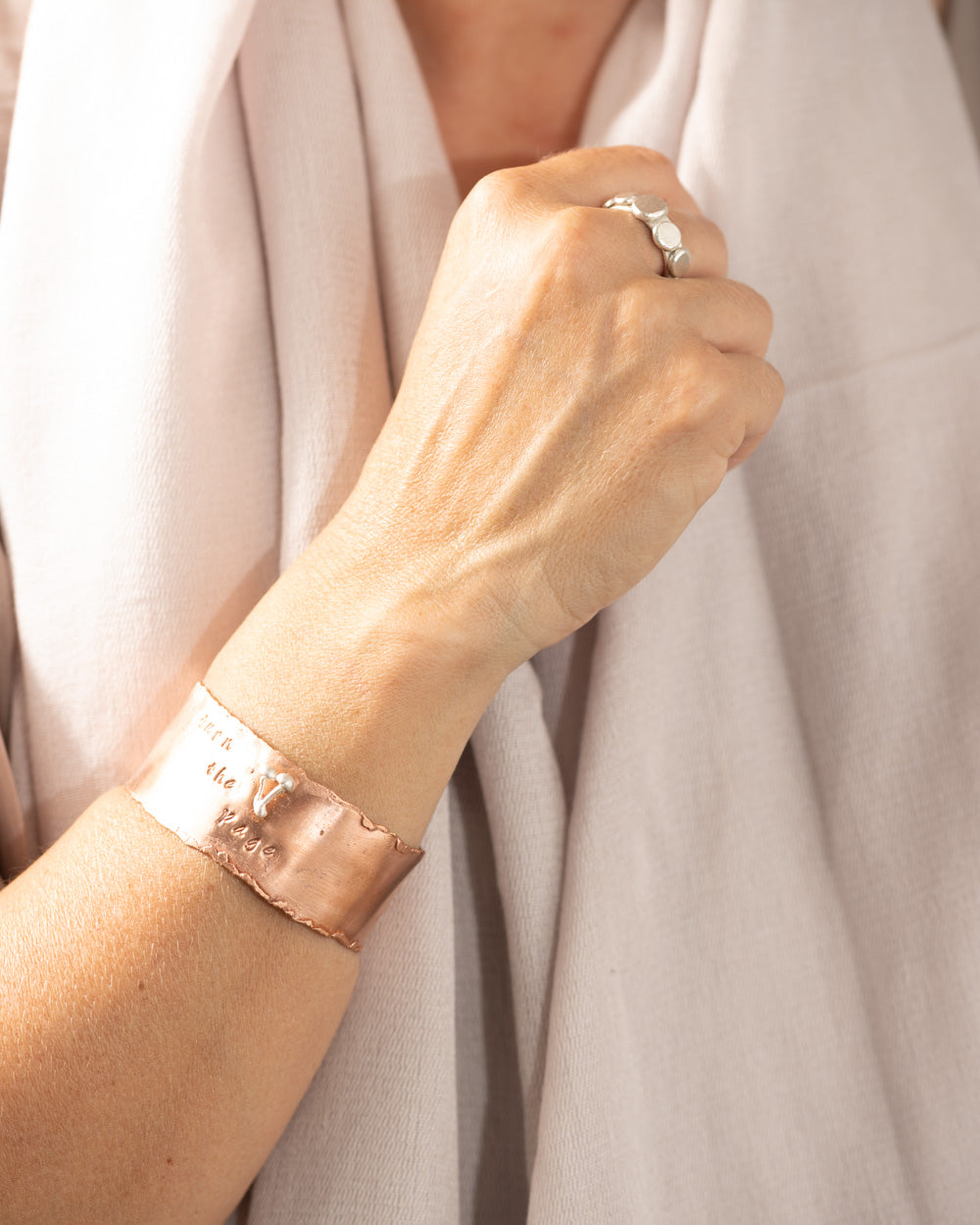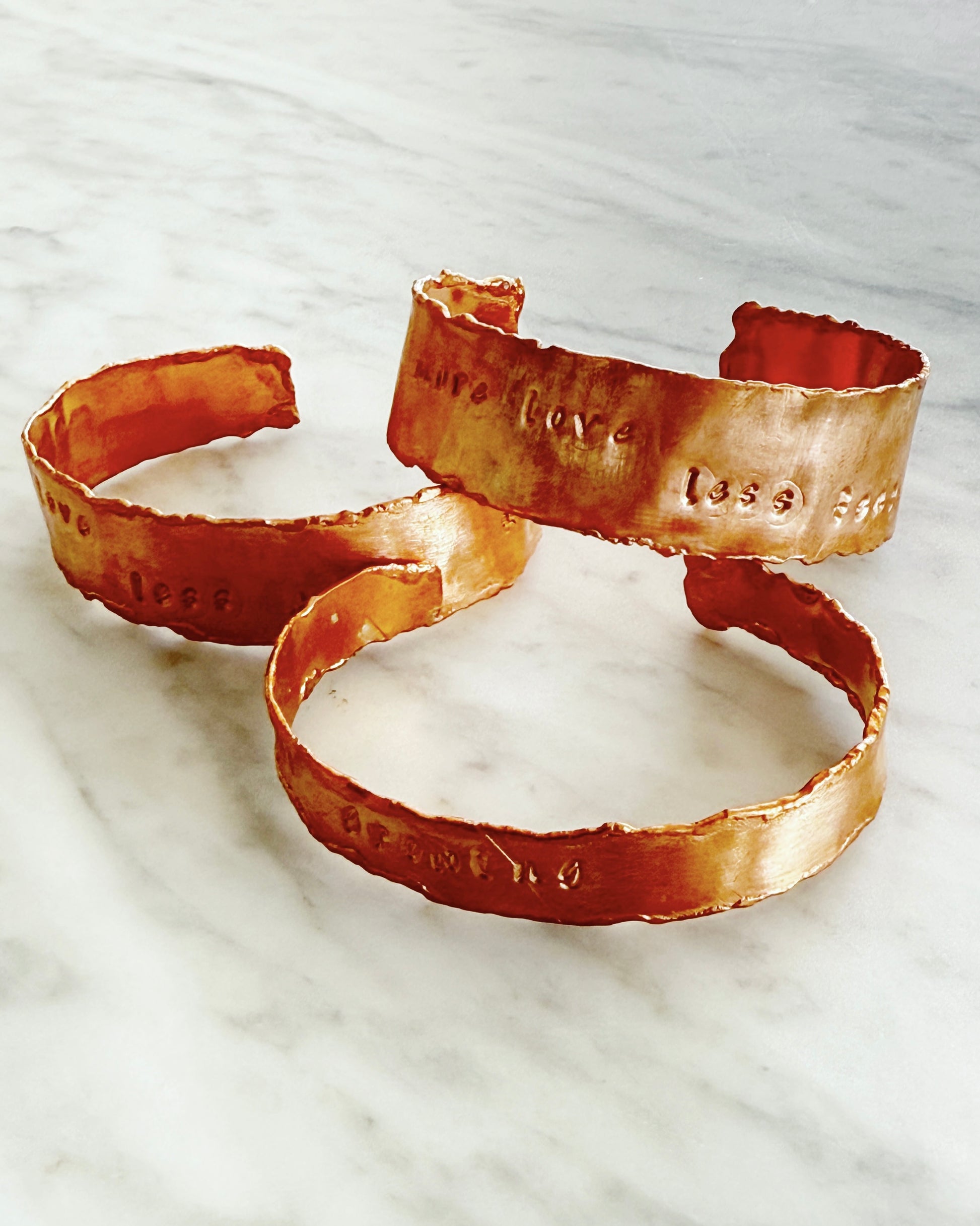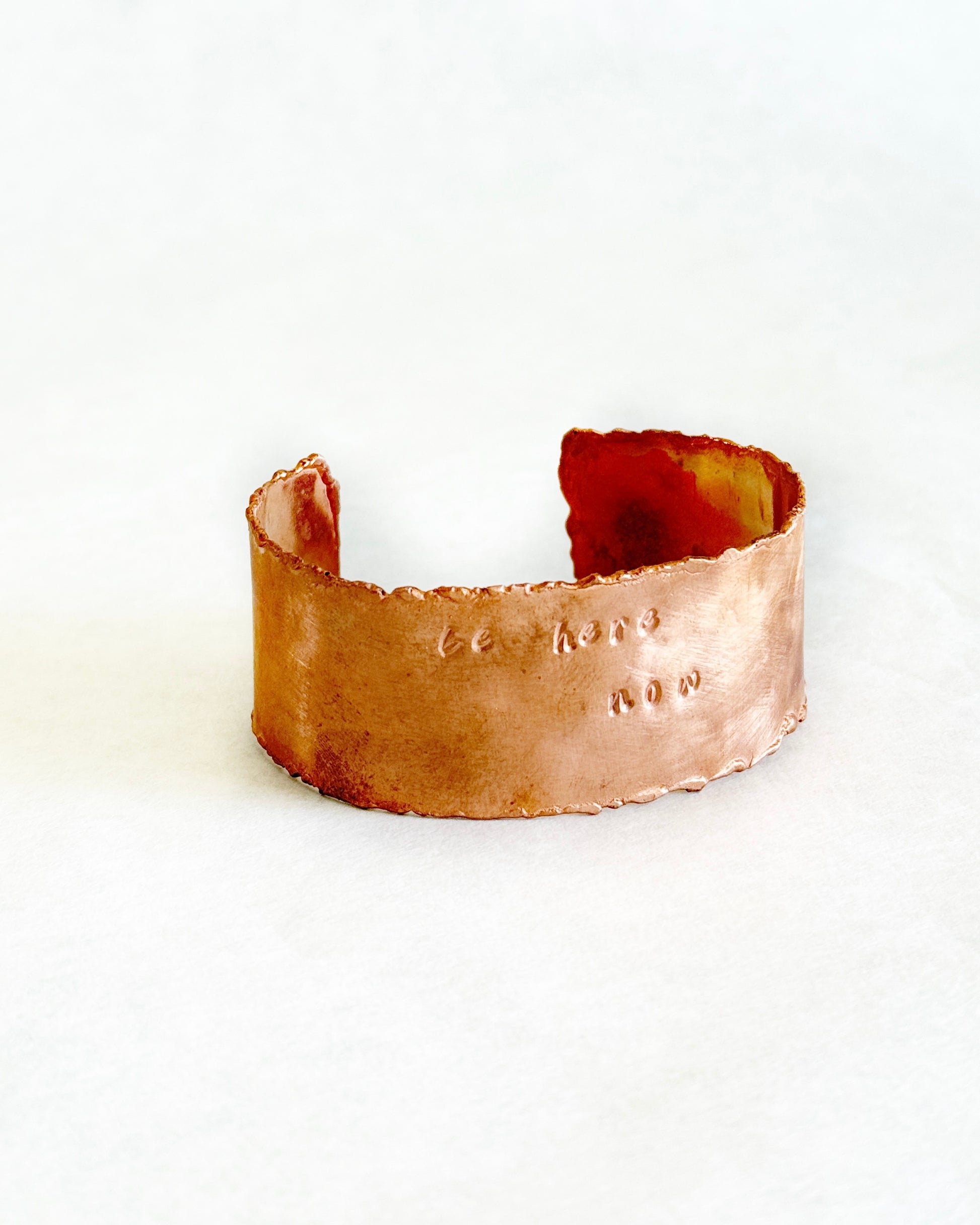 Carry a reminder of inspiration with you at all times with our Inspirational Copper Cuff. Each copper cuff was flame sculpted, then individually stamped with a motivational message and is designed to comfortably fit a 6-7 inch wrist. Keep yourself inspired and motivated throughout the day with this stylish accessory.