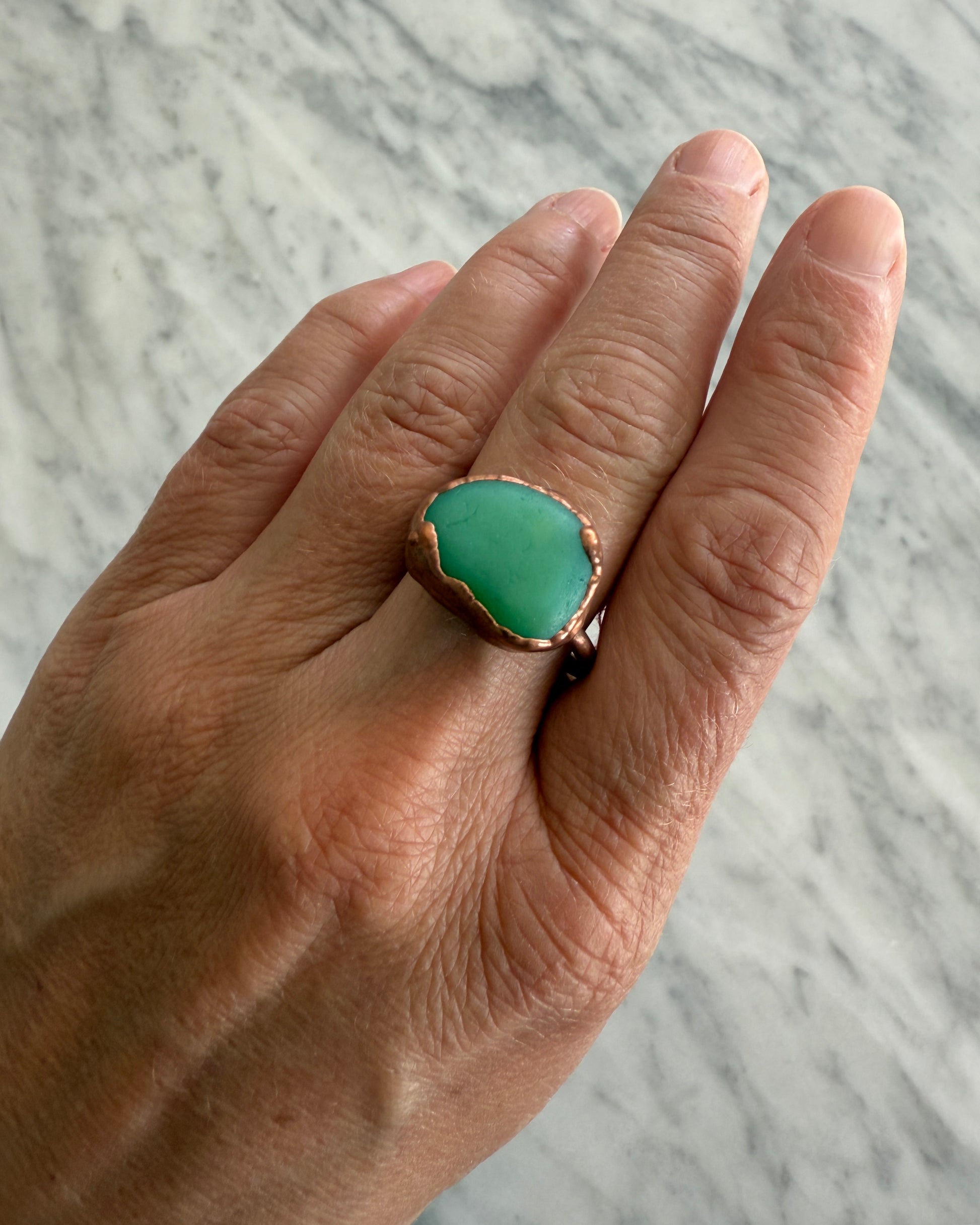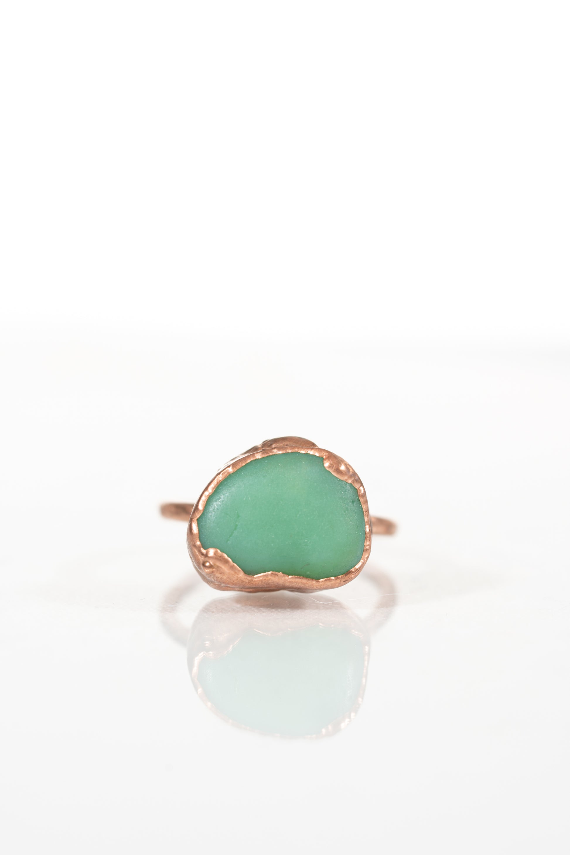Gorgeous Jadeite Sea Glass Ring (size 10.5) made from genuine jadeite dishes found in Scotland. This lovely sea glass piece is uniquely set in copper for a one-of-a-kind look. Embrace the beauty and history of the sea with this quirky and playful ring.
