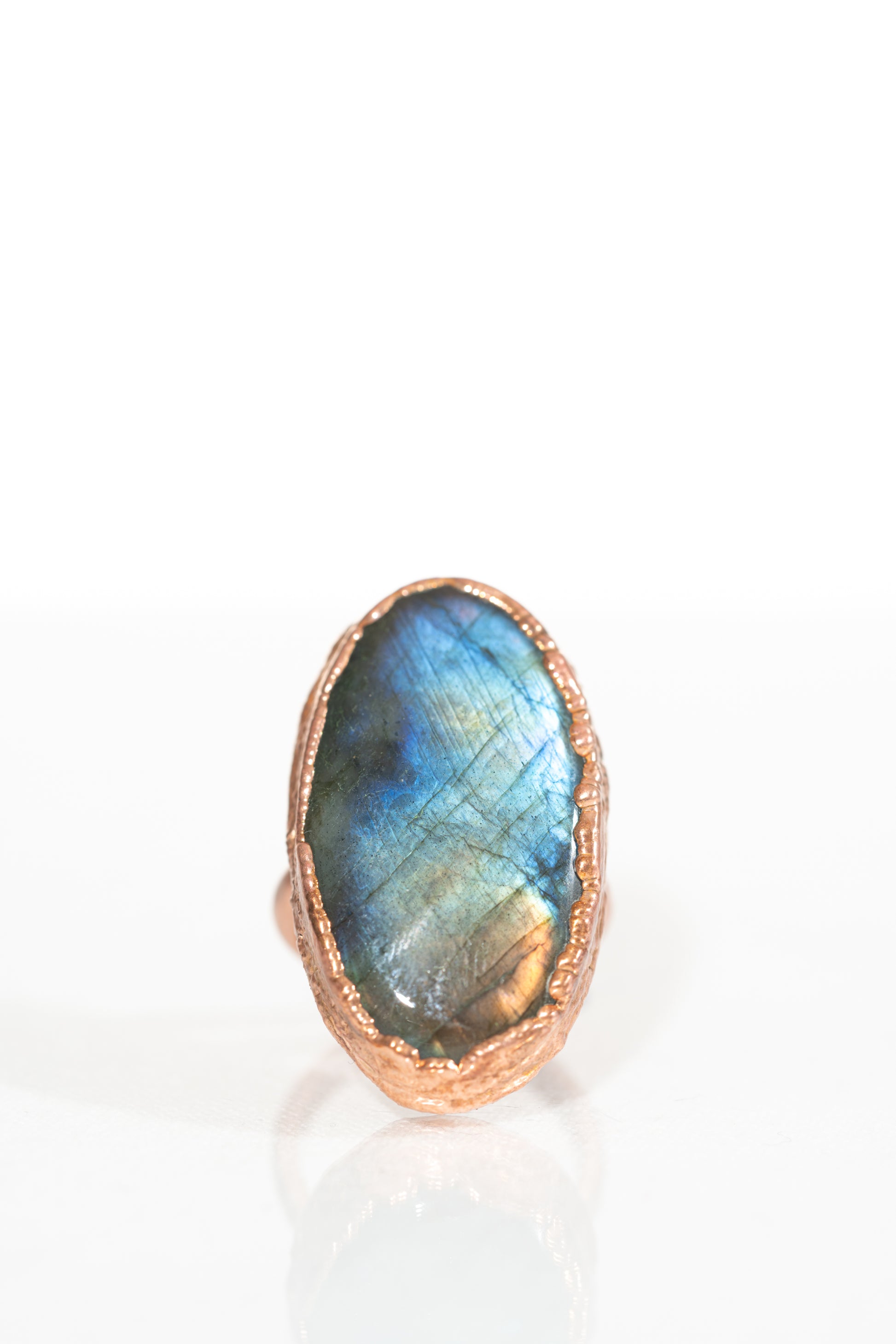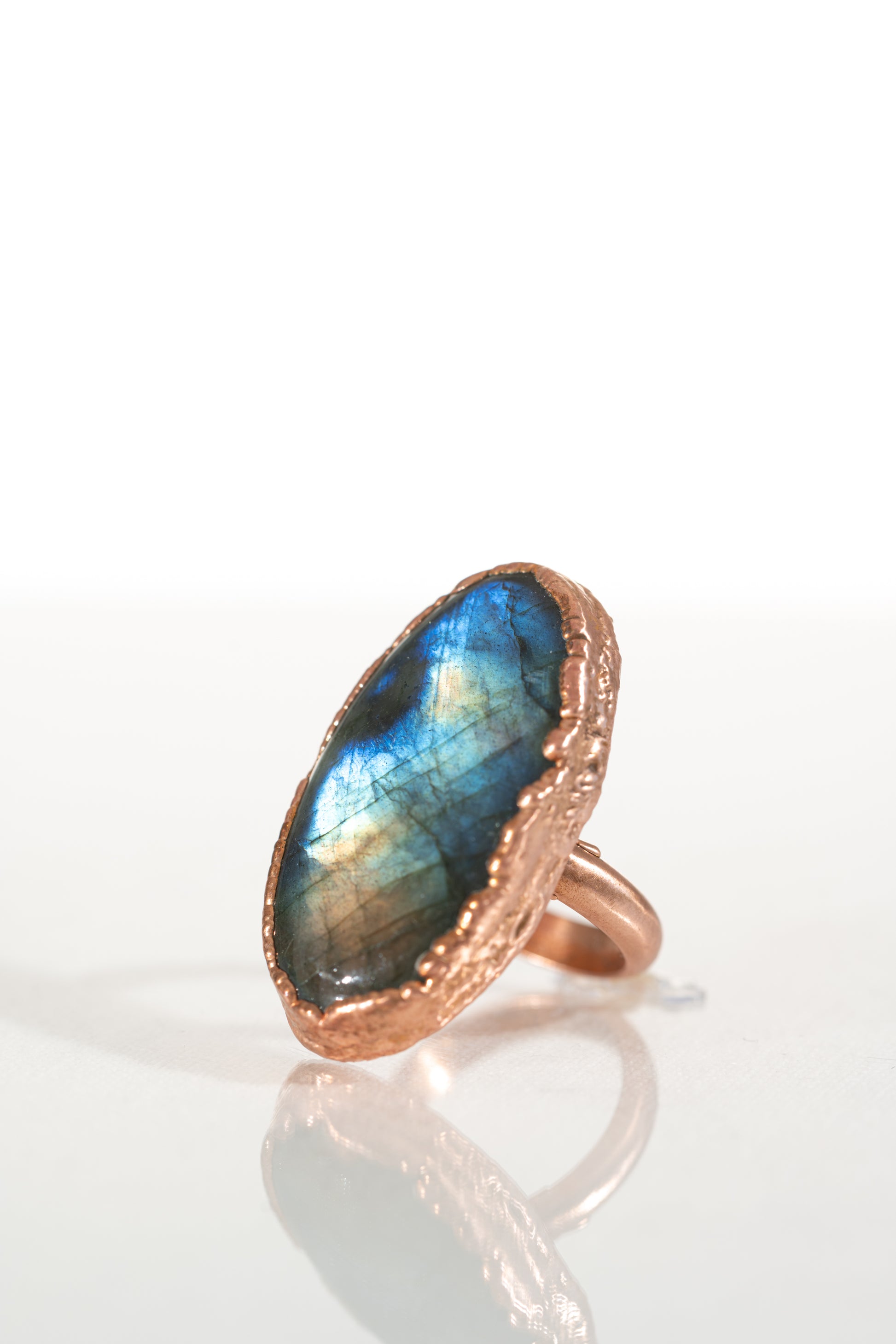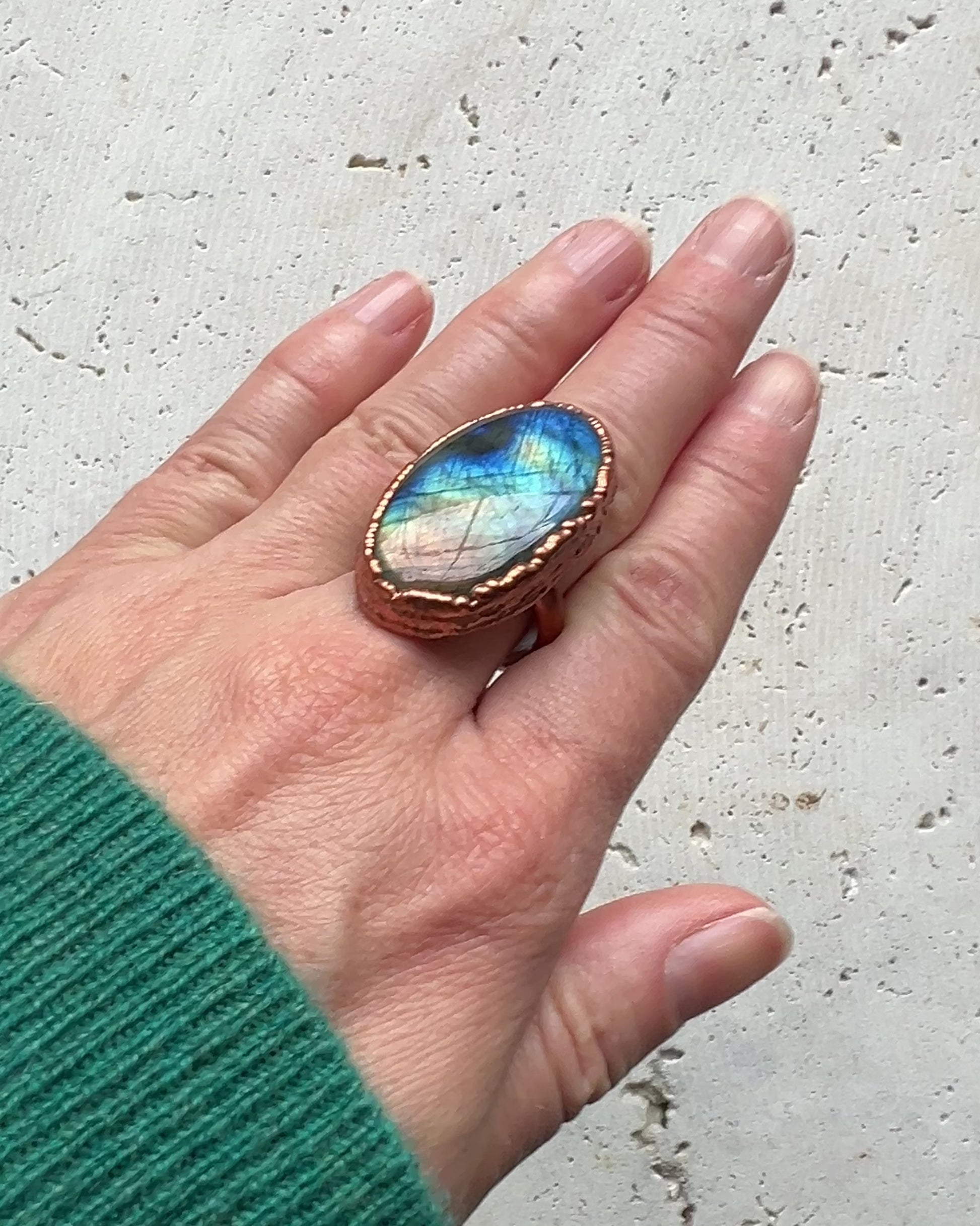 There's nothing quite like labradorite. It's said to be the aurora borealis trapped in a stone, and this one is no exception! Set in pure copper. Size 8