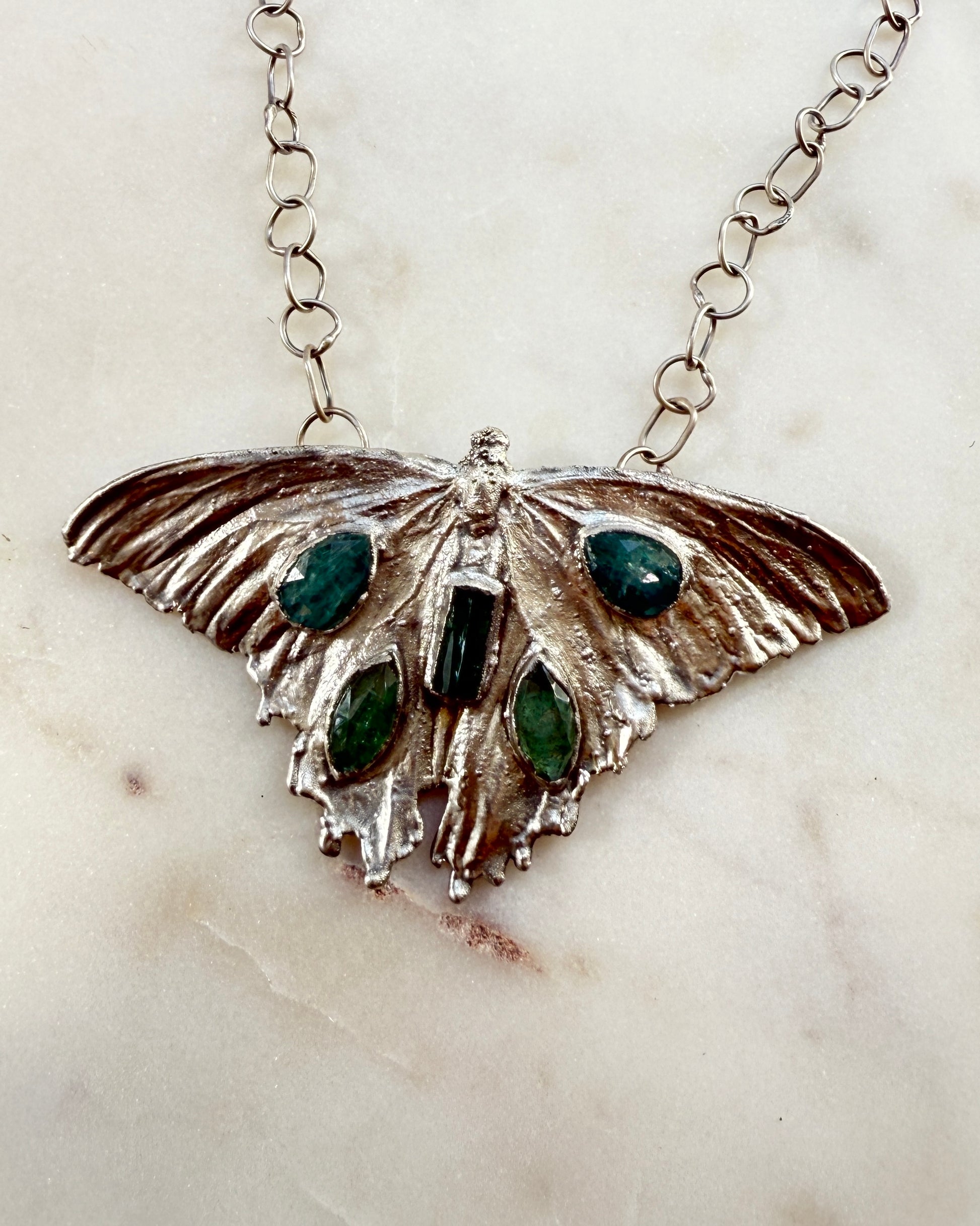 Command attention with a statement piece that’s as fearless as it is beautiful. A real butterfly, preserved through electroforming in solid silver, showcases its intricate wings with striking permanence. Tourmaline and kyanite stones bring rich, natural color, while the handmade sterling silver chain makes every detail feel intentional and strong. This is nature, elevated—and impossible to ignore.