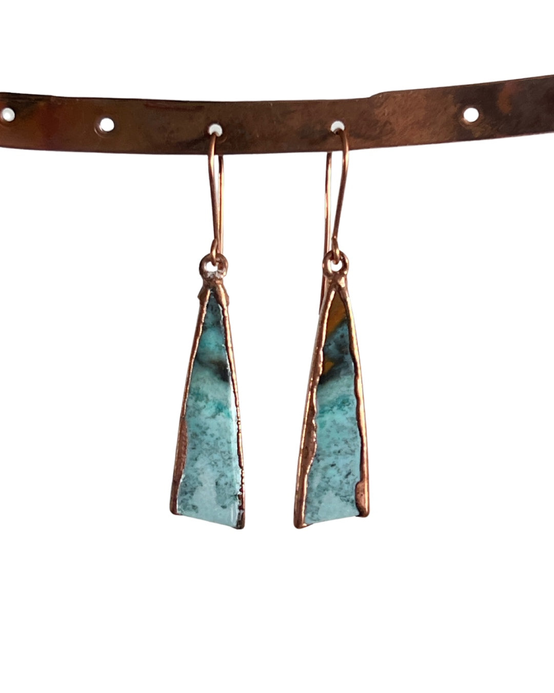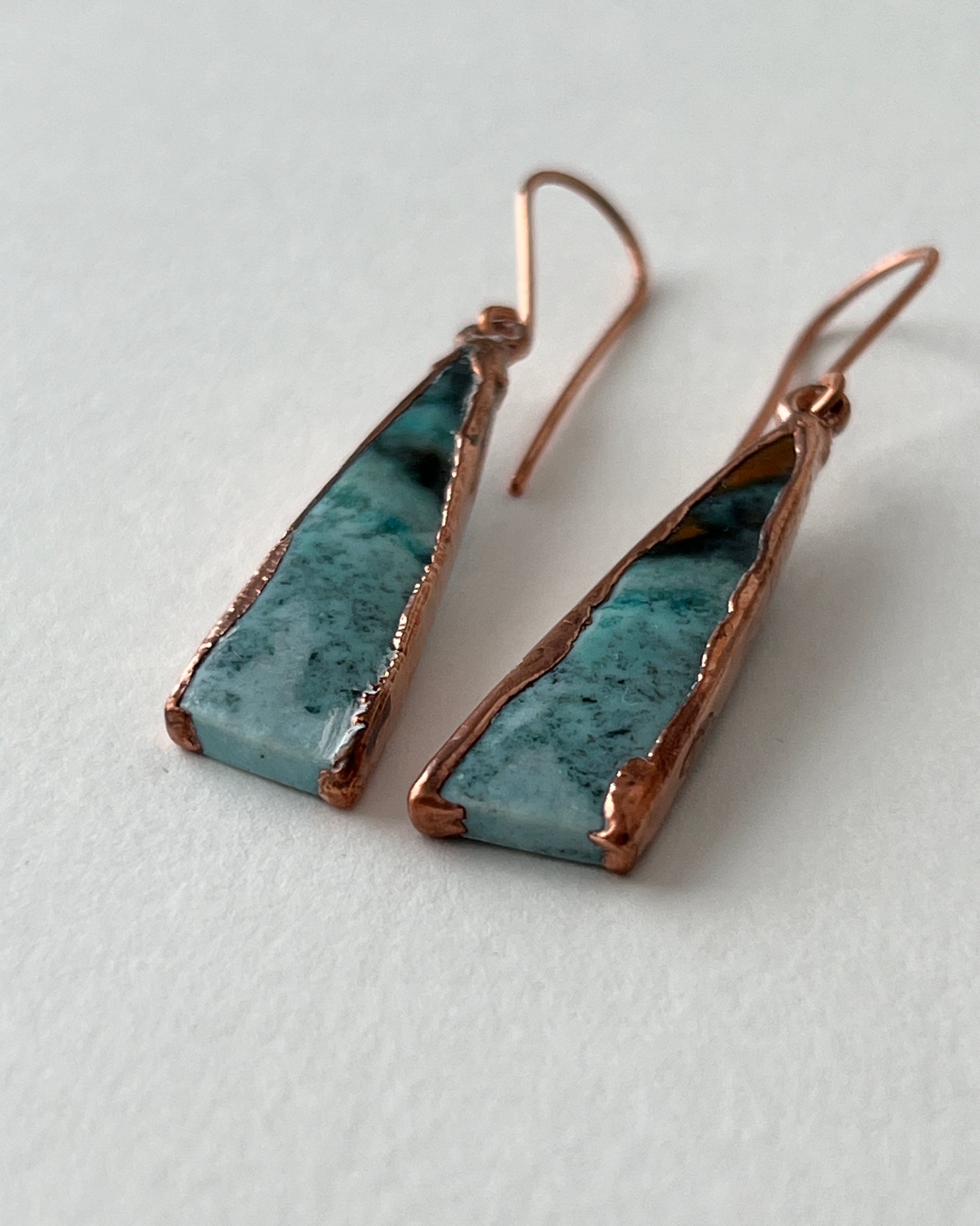 One of my favorites, wood opal stones in turquoise hues. Set in copper, I left the bottoms open for fun. Copper hooks.