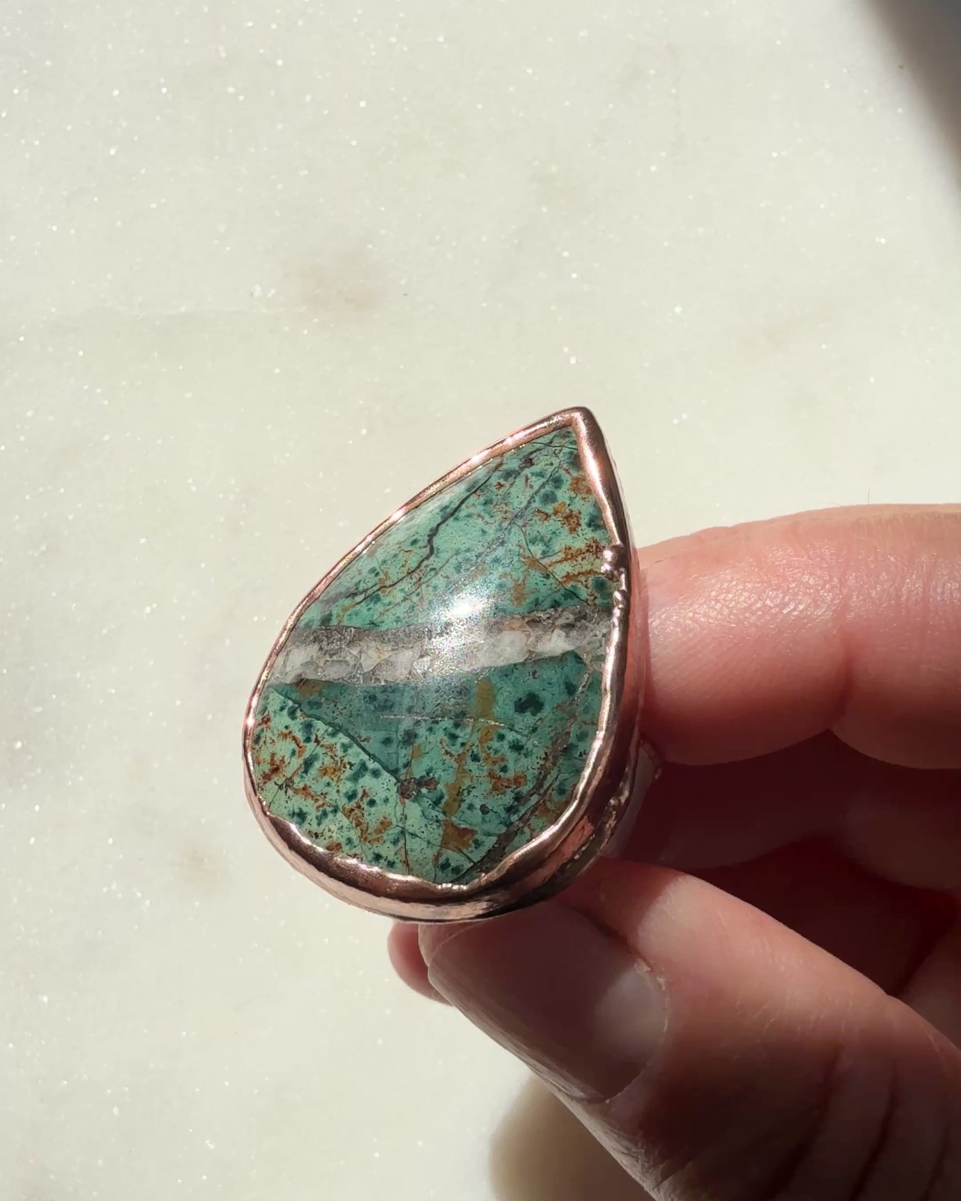 Add a splash of color and charm with this Morningdew Jasper Chunky Ring. Featuring a wide silver band that feels bold and comfortable, it’s perfectly paired with a warm copper setting that cradles a vibrant teal stone. This playful mix of metals and hues makes it a standout piece for any outfit, ready to brighten your day with every wear. Size 8.5