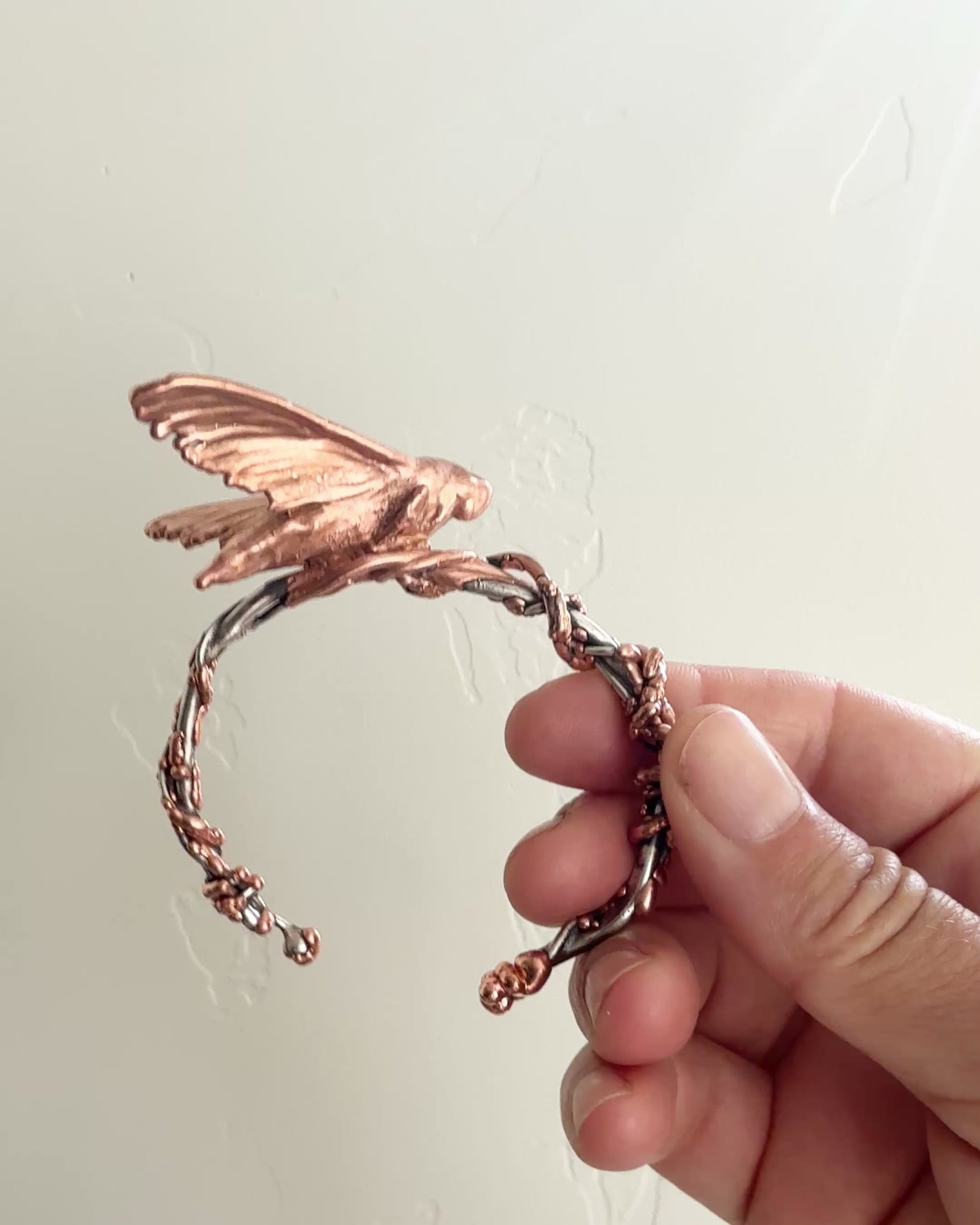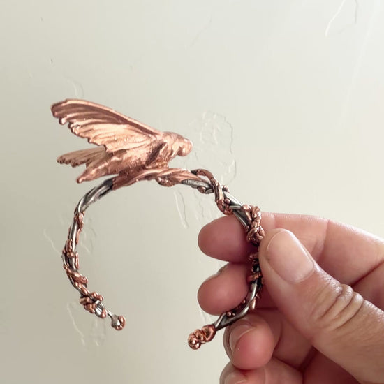 Embrace the mysterious allure of twilight with this stunning moth cuff bracelet. A real moth, electroformed in warm copper, rests delicately atop an organic sterling silver cuff—melding nature’s intricate beauty with bold, wearable art. This piece is for the woman who moves through life with quiet power and an untamed spirit, drawn to the magic found in shadows and soft light. It’s more than jewelry—it’s a statement of transformation, resilience, and fierce elegance wrapped around your wrist.