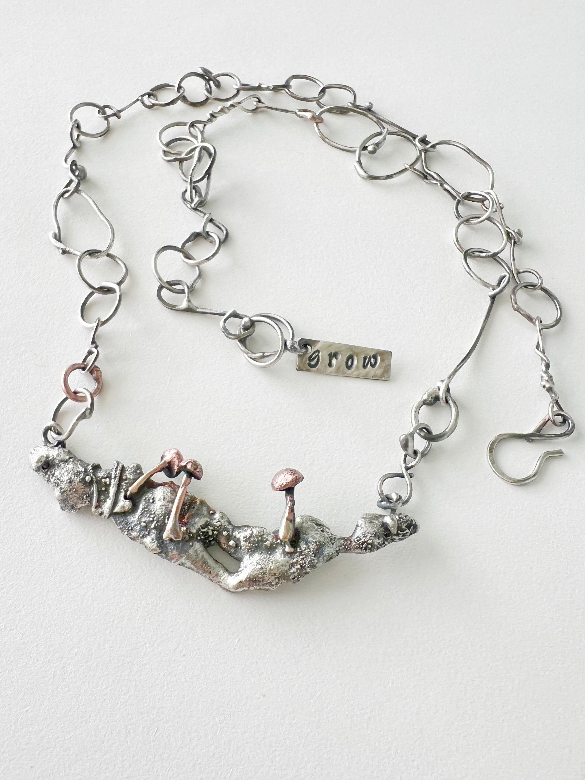 The necklace that started this whole collection! Embrace growth with our Mushroom "Grow" Necklace. Handcrafted with sterling silver and copper, this necklace features a flame-sculpted tree branch, delicate mushrooms, and a handmade organic chain. A symbolic reminder to find strength and growth in the most challenging times. Chain is 22 inches but can be hooked at any length.