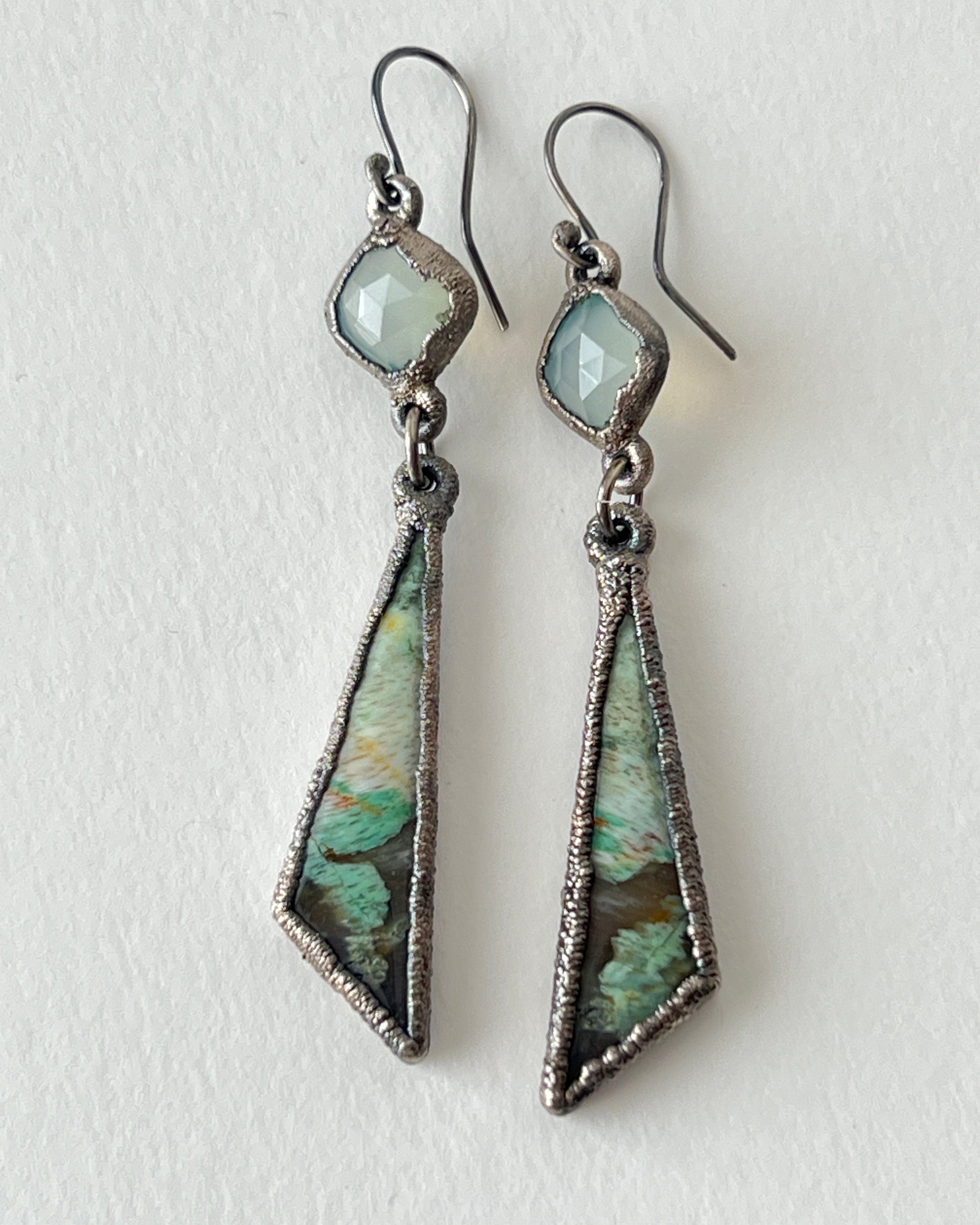 These are some of the best opal wood stones I've ever seen! So many colors in them. They were set in fine silver along with faceted aqua chalcedony stones and have sterling silver hooks.