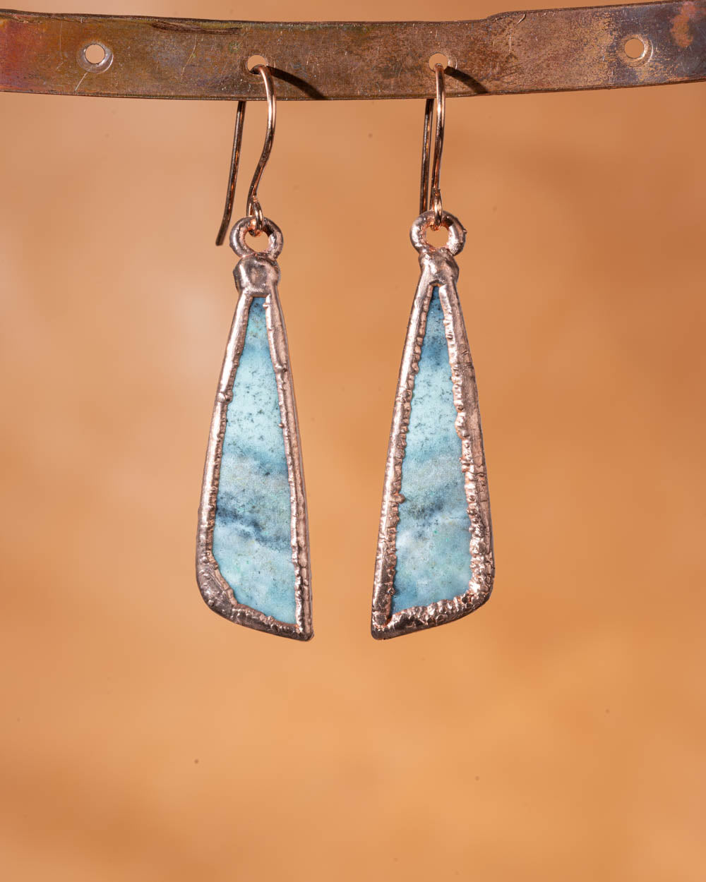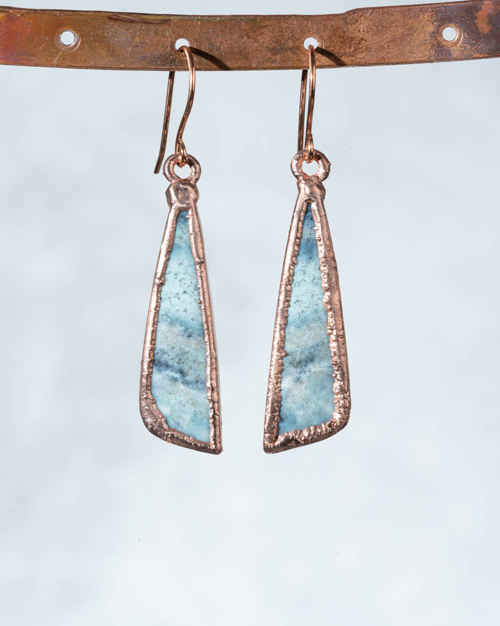 Experience the enchanting beauty of these handcrafted Opalized Wood Dangle Earrings! Made with rare Indonesian opal wood stones, each earring is set in copper and is hypoallergenic for sensitive ears. The lightweight design ensures comfortable wear, while the mesmerizing blue of the stones will add a touch of unique elegance to any outfit. Elevate your jewelry collection with these stunning earrings today! About 2 inches long and weighing just 5 grams each. (A US quarter is 6 grams.)