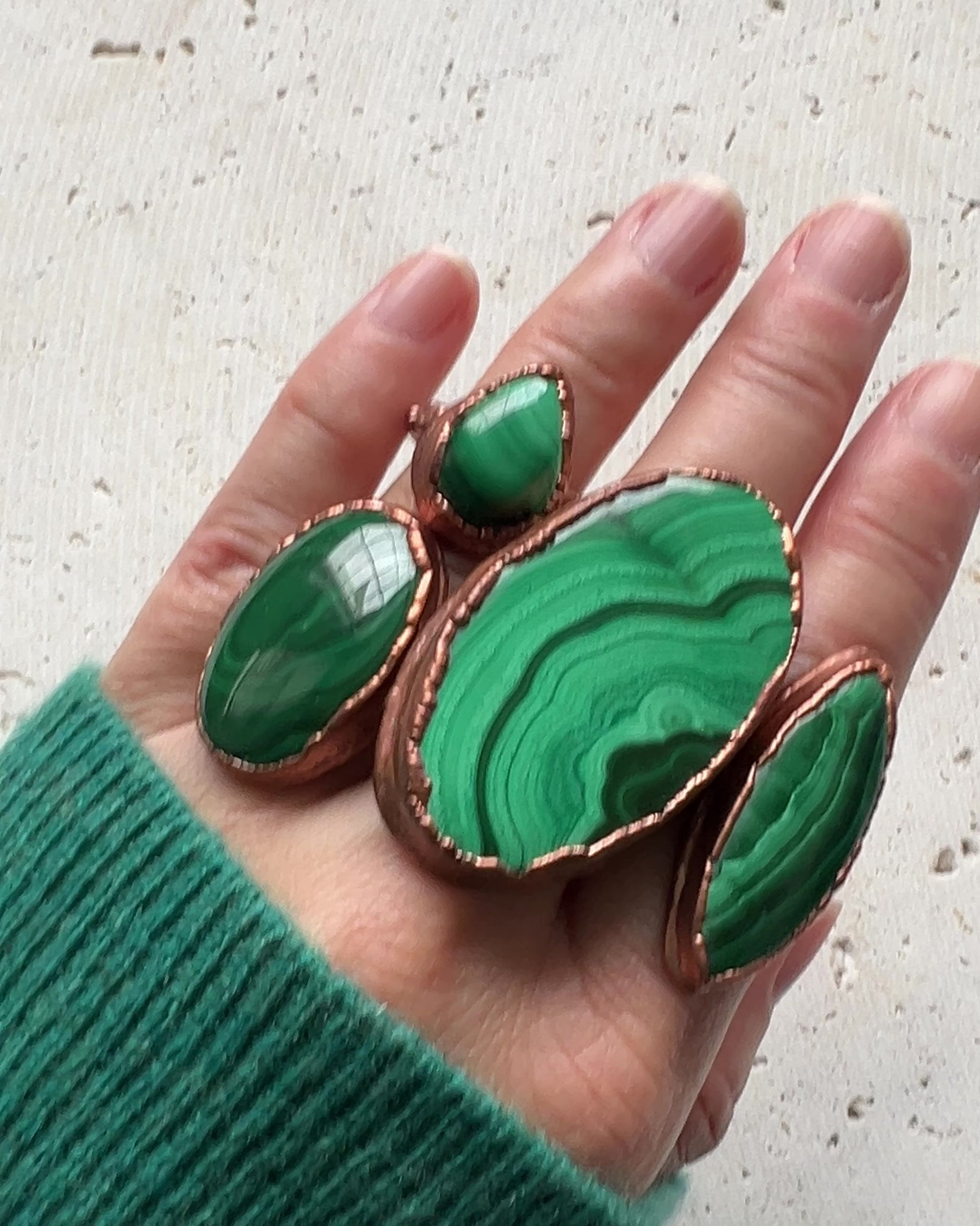This pretty little green malachite is set in a very organic copper setting with a textured band. Size 7.