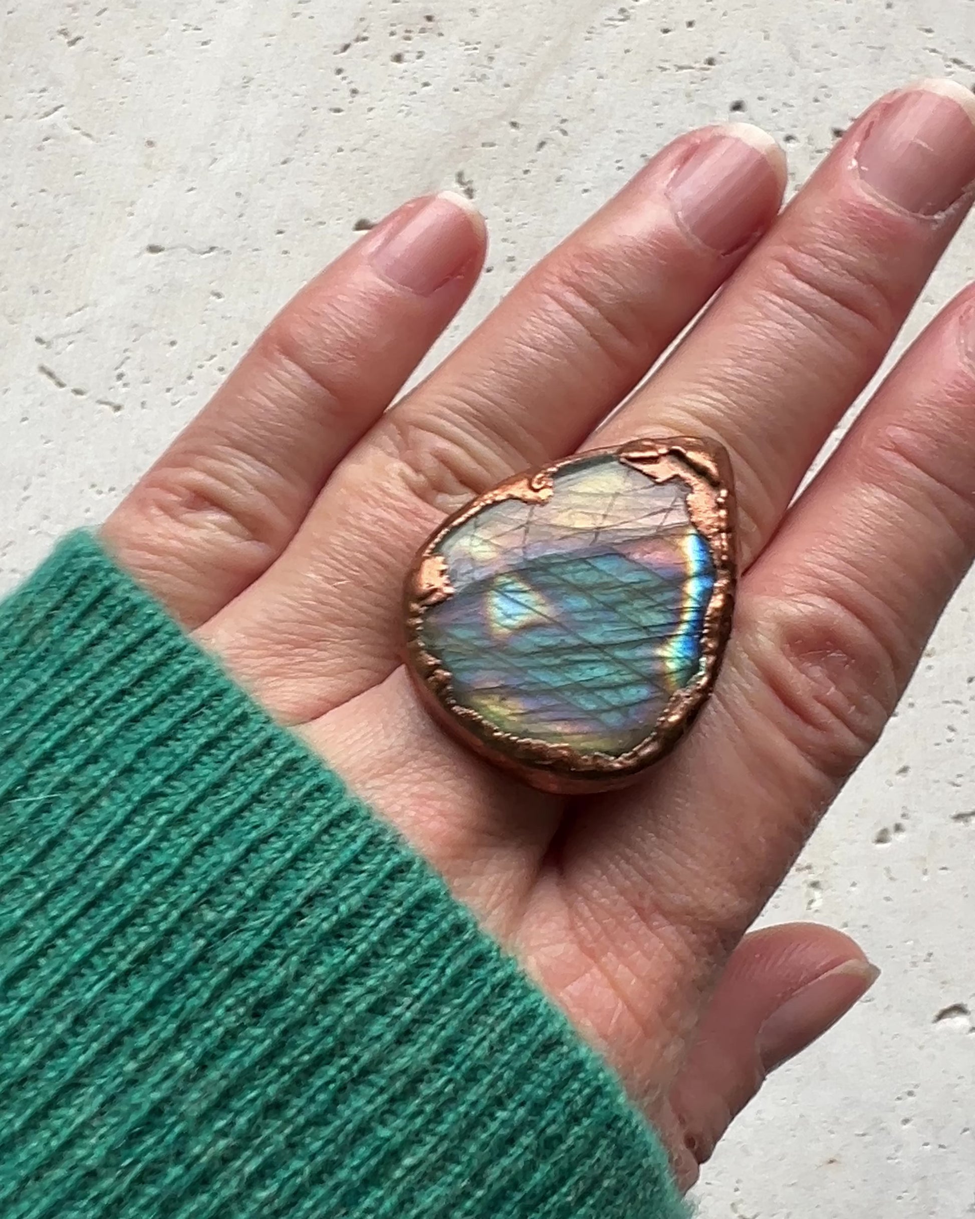 This chunky labradorite statement ring has a rainbow of colors! Blues, pinks, yellows and more. Electroformed in pure copper with a solid copper band. This ring is a size 8 1/2.