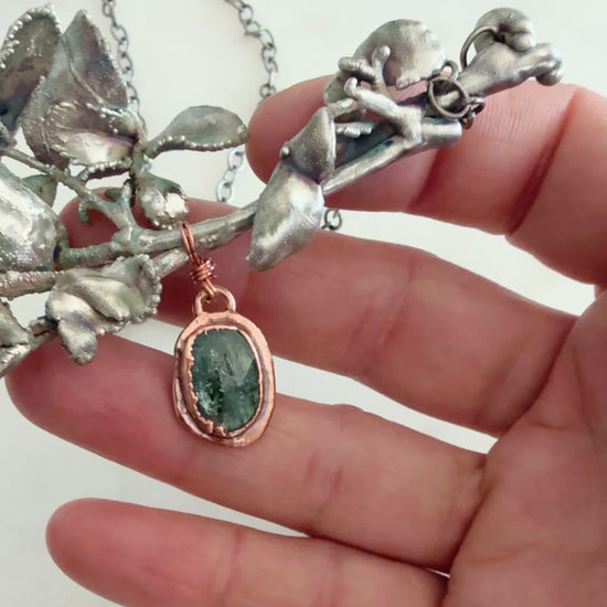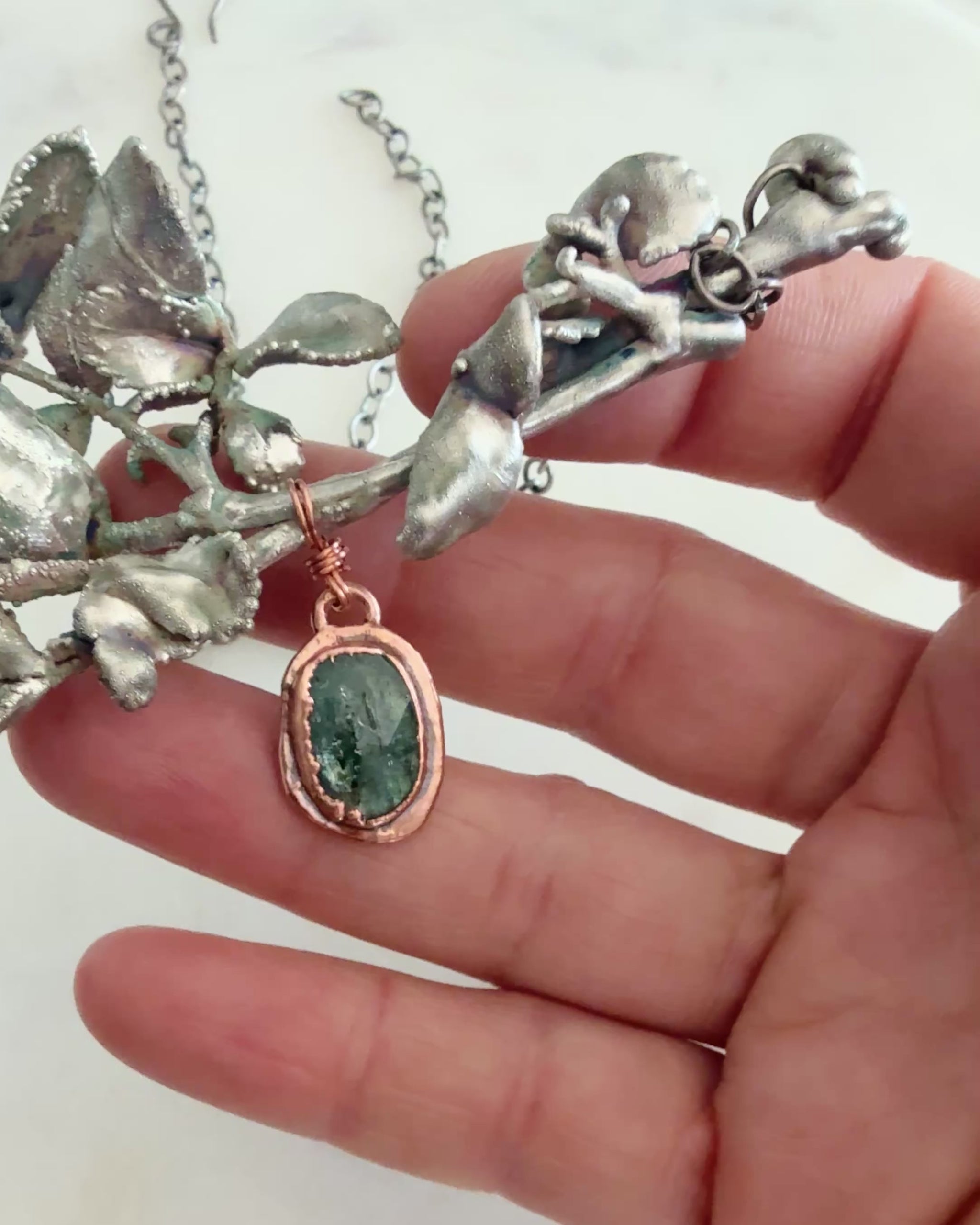 This rosehip necklace with green kyanite is a stunner! A real rosehip, electroformed in silver, cradles a vibrant green kyanite gemstone set in copper. Suspended from a sterling silver chain, this nature-inspired piece blends organic texture with refined craftsmanship. This necklace is one-of-a-kind.