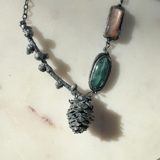 Embrace nature’s raw beauty with this striking necklace featuring a real pine cone and twig, electroformed in silver with a dramatic blackened patina. Paired with a large teal kyanite stone and a soft peach sunstone, this piece blends rugged textures with vibrant color. It’s a powerful statement of wilderness refined into wearable art.