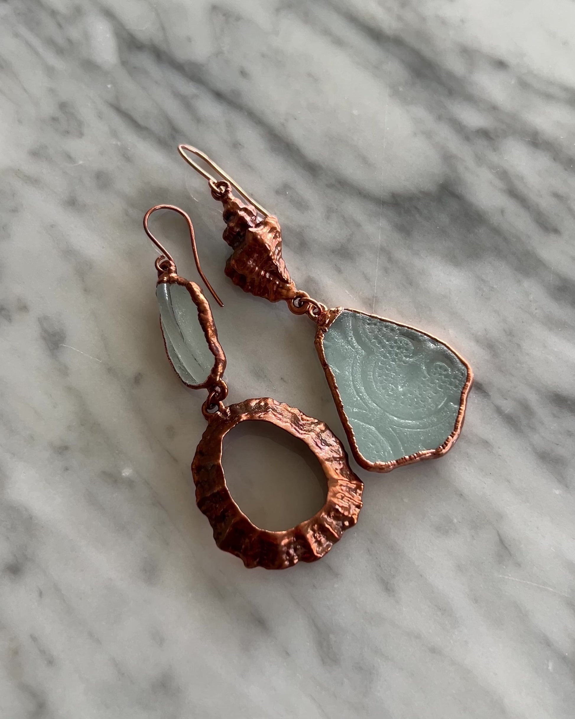 Oh how I love a good pair of mismatched earrings! These are made with REAL shells (not castings, the shells are actually inside the metal), and REAL sea glass found on a beach in Portugal by me. Electroformed in pure copper.