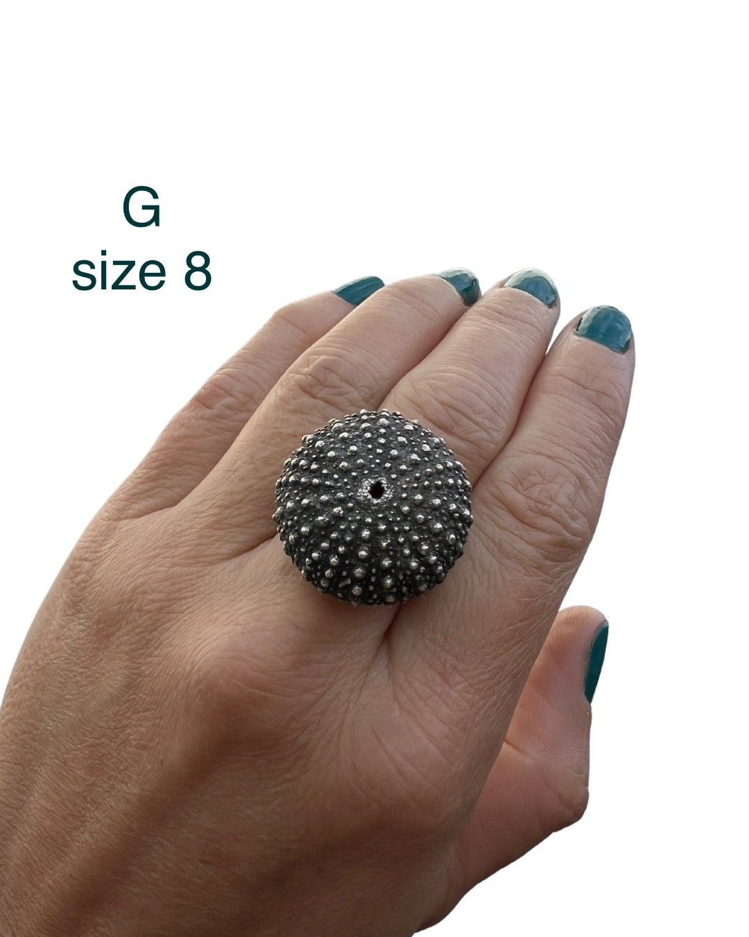 REAL sea urchin ring. Each sea urchin ring is made from a real urchin shell, not a casting. These rings are either copper with a copper band, or all silver (pure sterling band with fine silver urchin), with the exception of urchin 'E' which is copper with a sterling band. Most of these can easily be sized up by stretching the band up to one whole size. For example, a size 8 can become a size 8.5 or size 9.