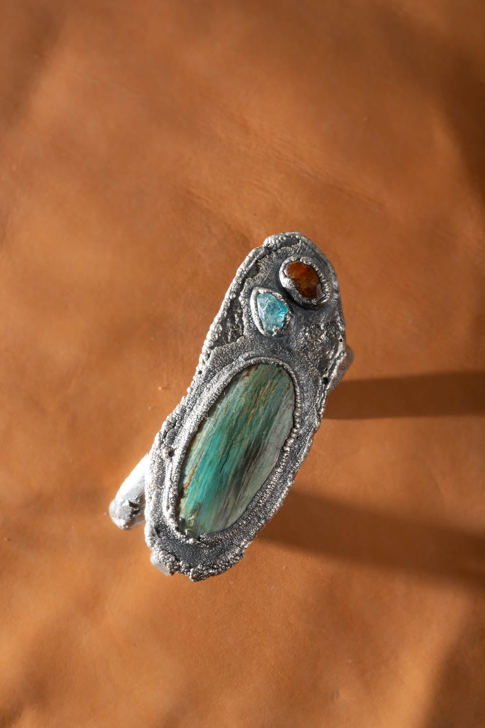 Take a risk and add this Super Chunky Silver Cuff Bracelet to your collection. The beautiful opal wood stone with its vibrant colors will make a bold statement. The neon apatite and orange kyanite accent stones add a touch of adventure. Made with recycled silver, the organic texture adds a unique touch. Fits a 6-8 inch wrist.