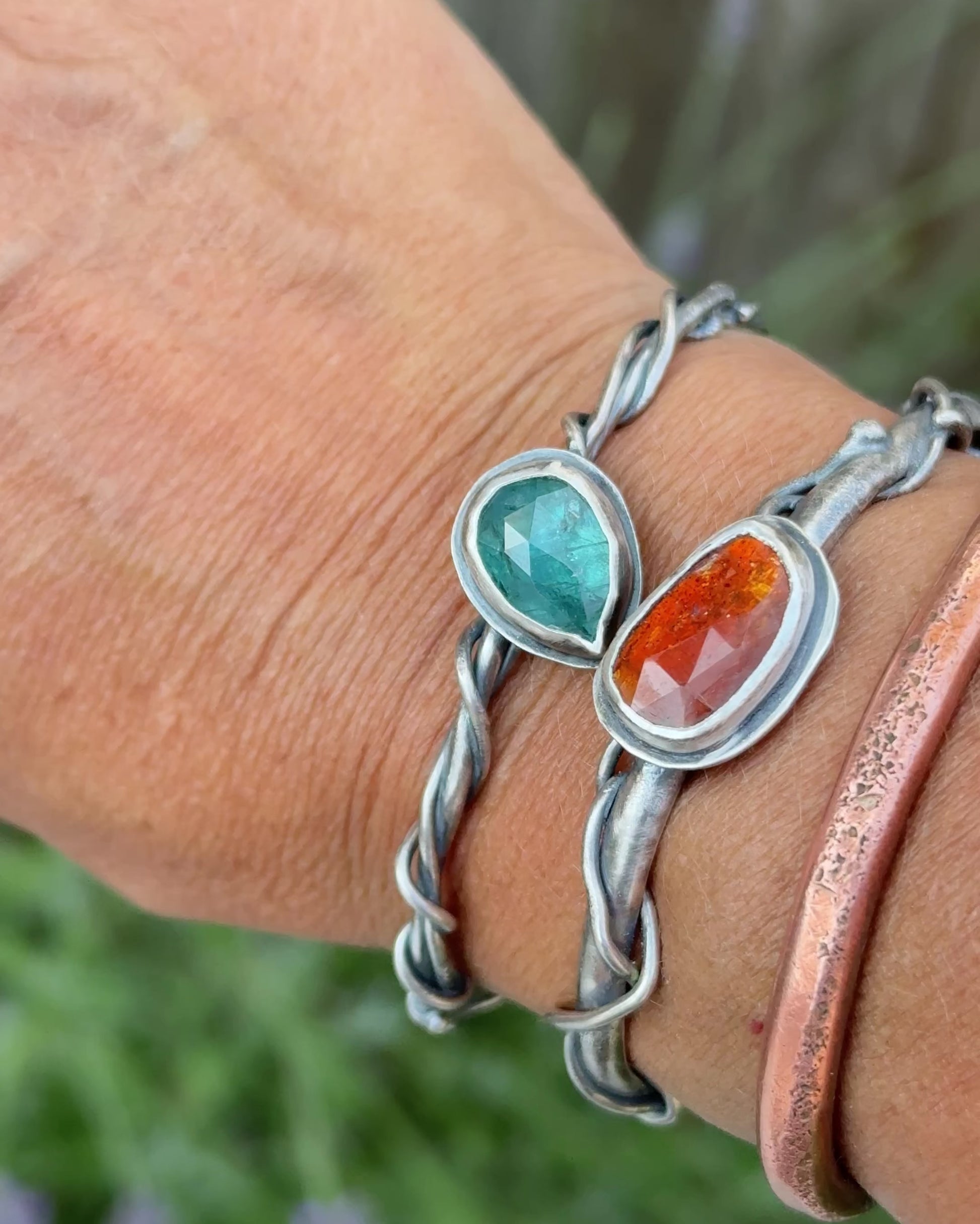 Wrap your wrist in the hypnotic depths of glacial blue teal kyanite, set within a fierce yet fluid cuff of organically fused silver. This bracelet is a bold expression of raw elegance—where the wild beauty of nature meets refined craftsmanship. It’s made for the woman who commands attention effortlessly, carrying both strength and mystery in every move.