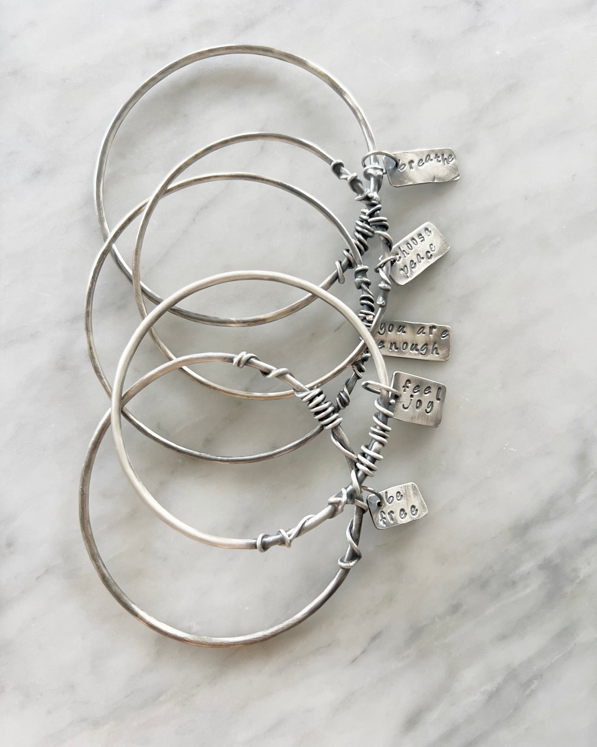 Elevate your style and spirit with our Wise Words Bangle. Made of sterling silver, each bangle carries a powerful message that will inspire and motivate you. Select from a range of sizes to find the perfect fit. Let our bangle be a reminder of your inner strength and wisdom.
